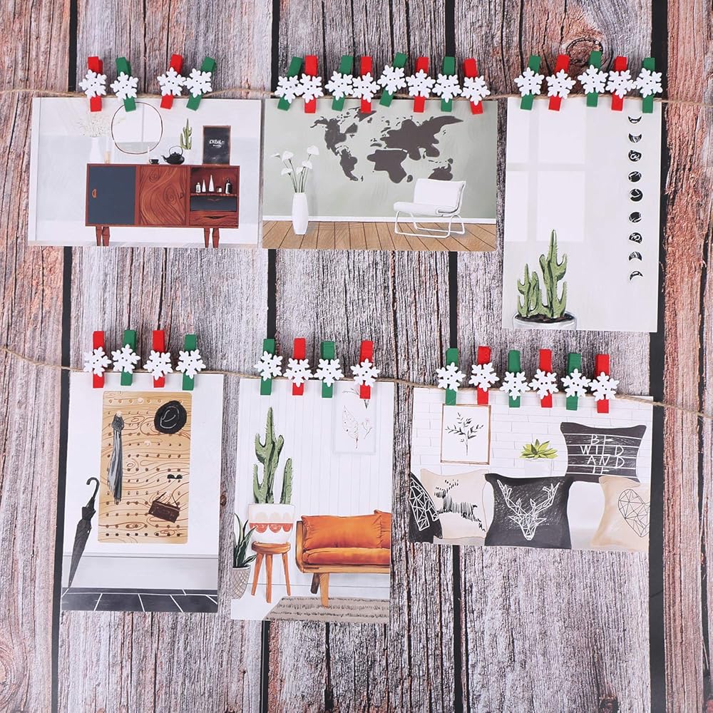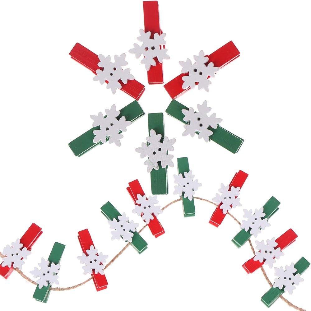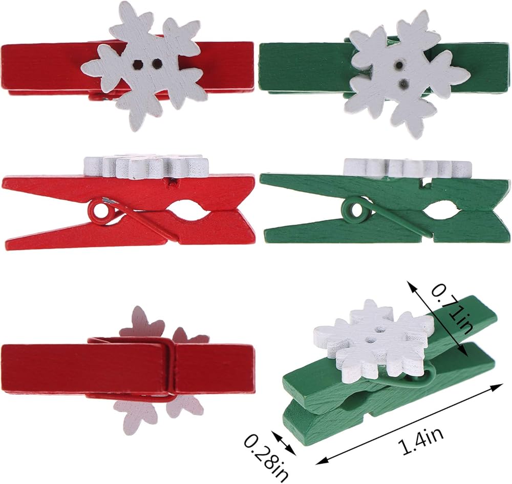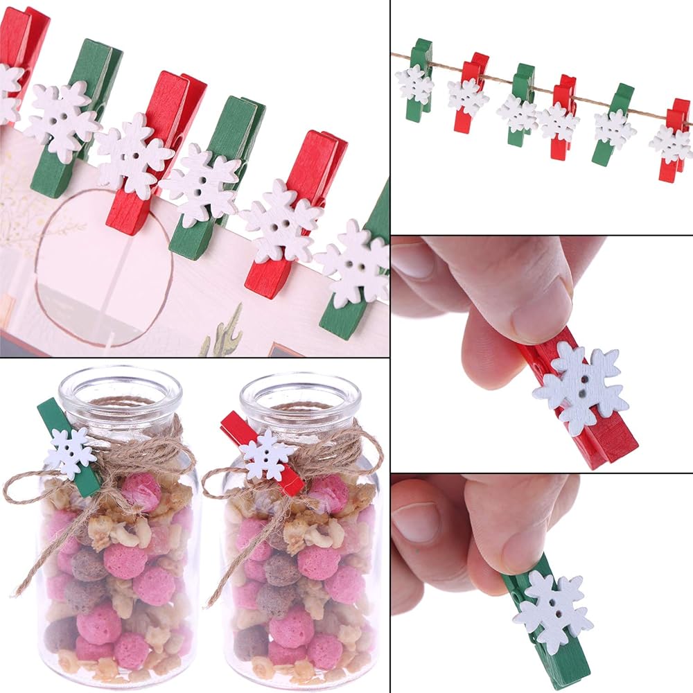 ❄ تصميم جميل: مجموعة مشابك غسيل خشبية صغيرة بتصميمين، مشابك خضراء مع ندف ثلج أبيض، مشابك حمراء مع ندف ثلج أبيض، لطيفة ورائعة، تجلب الألوان والمرح إلى غرفتك أو حفلتك.