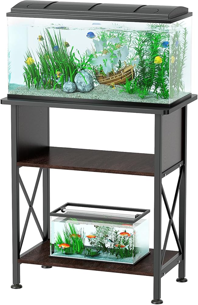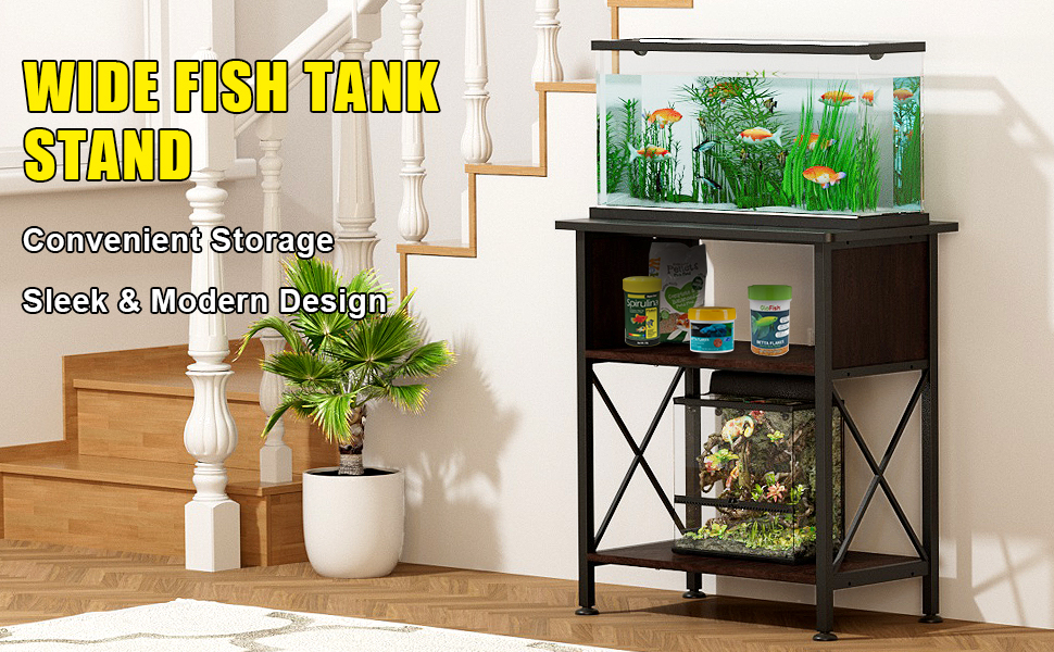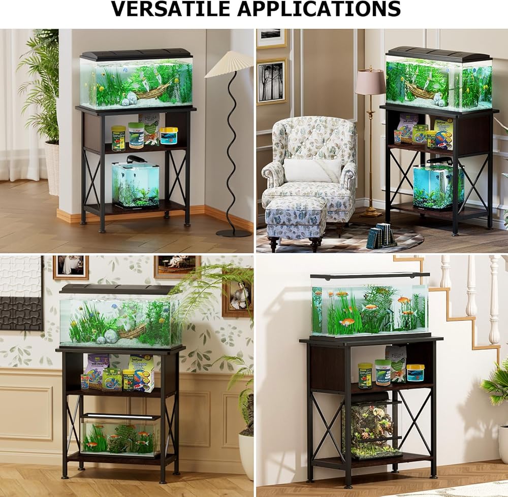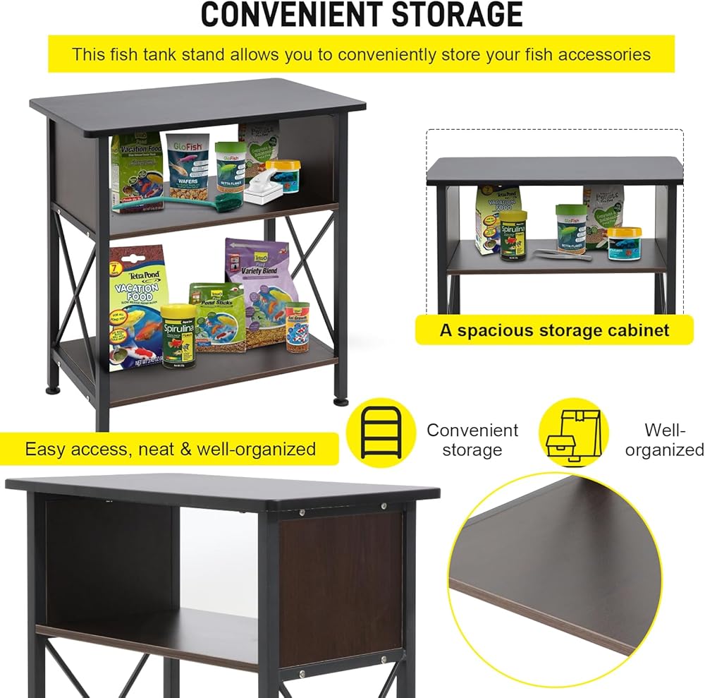 مجهزة بخزانة لتخزين طعام الأسماك وأدوات التنظيف وغيرها من ملحقات حوض السمك، مما يجعل من السهل الحفاظ على كل شيء منظمًا. كل ذلك في تكوين بدون فوضى، سهولة الوصول، أنيق ومنظم بشكل جيد. الخزانات غير متضمنة. أبعاد الحامل: 30.7 انش طول × 12.6 انش عرض × 31.5 انش ارتفاع، سعة حمل الحامل: 330 باوند لسطح الطاولة و110 باوند للرف السفلي.