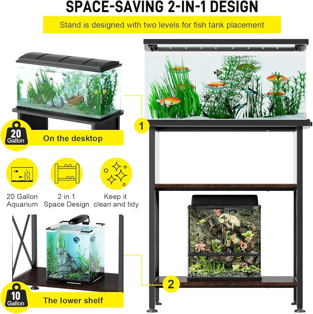 【تصميم مساحة 2 في 1】- يتميز حامل حوض السمك هذا بتصميم مبتكر مزدوج الطبقات. مستوى سطح المكتب العلوي قادر على استضافة أحواض أسماك مختلفة الأشكال بشكل مريح بسعة 20-29 جالون، في حين أن المستوى السفلي مثالي للخزانات الصغيرة بسعة 5-10 جالون، مما يزيد من الاستخدام الفعال للمساحة ويحافظ على منطقة تخزين حوض السمك أنيقة ومنظمة.