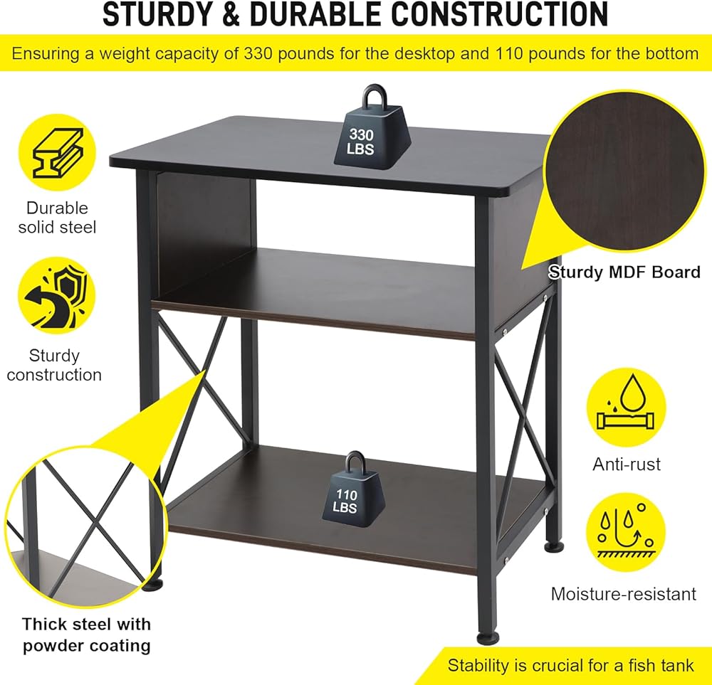 【الأبعاد وسعة التحميل】- أبعاد حامل حوض السمك 30.7 انش × 12.6 انش × 31.5 انش، ويتميز بسعة وزن تصل إلى 330 باوند لسطح المكتب و110 باوند للجزء السفلي.