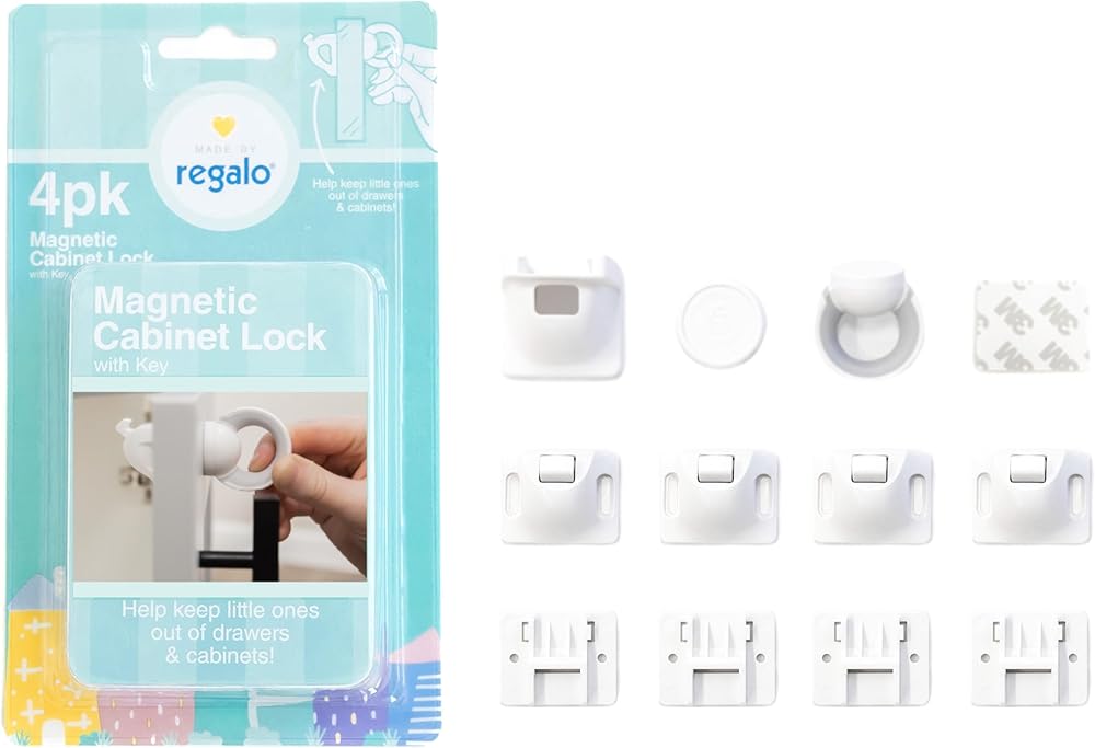 The Regalo Home Safety Magnetic Cabinet Locks keep your busy toddlers from opening and getting into your cupboards. They work great in bathrooms, kitchens, and other areas around your home. The Home Safety Magnetic Cabinet Locks are completely hidden so they won't disrupt your home design. The included Magnetic Key releases the lock for easy access. Make baby proofing your home easy with our Regalo Home Safety Magnetic Cabinet Locks.