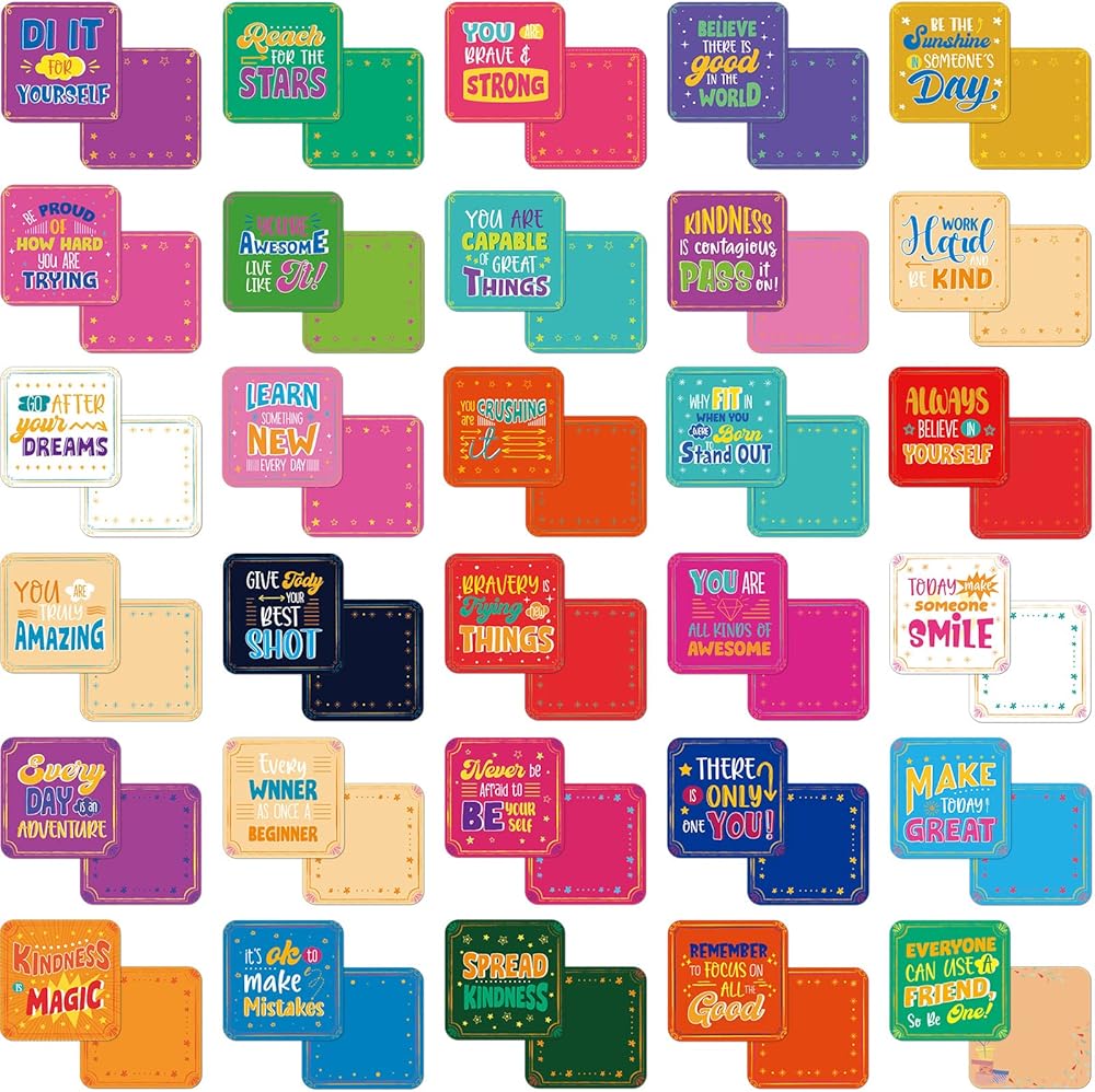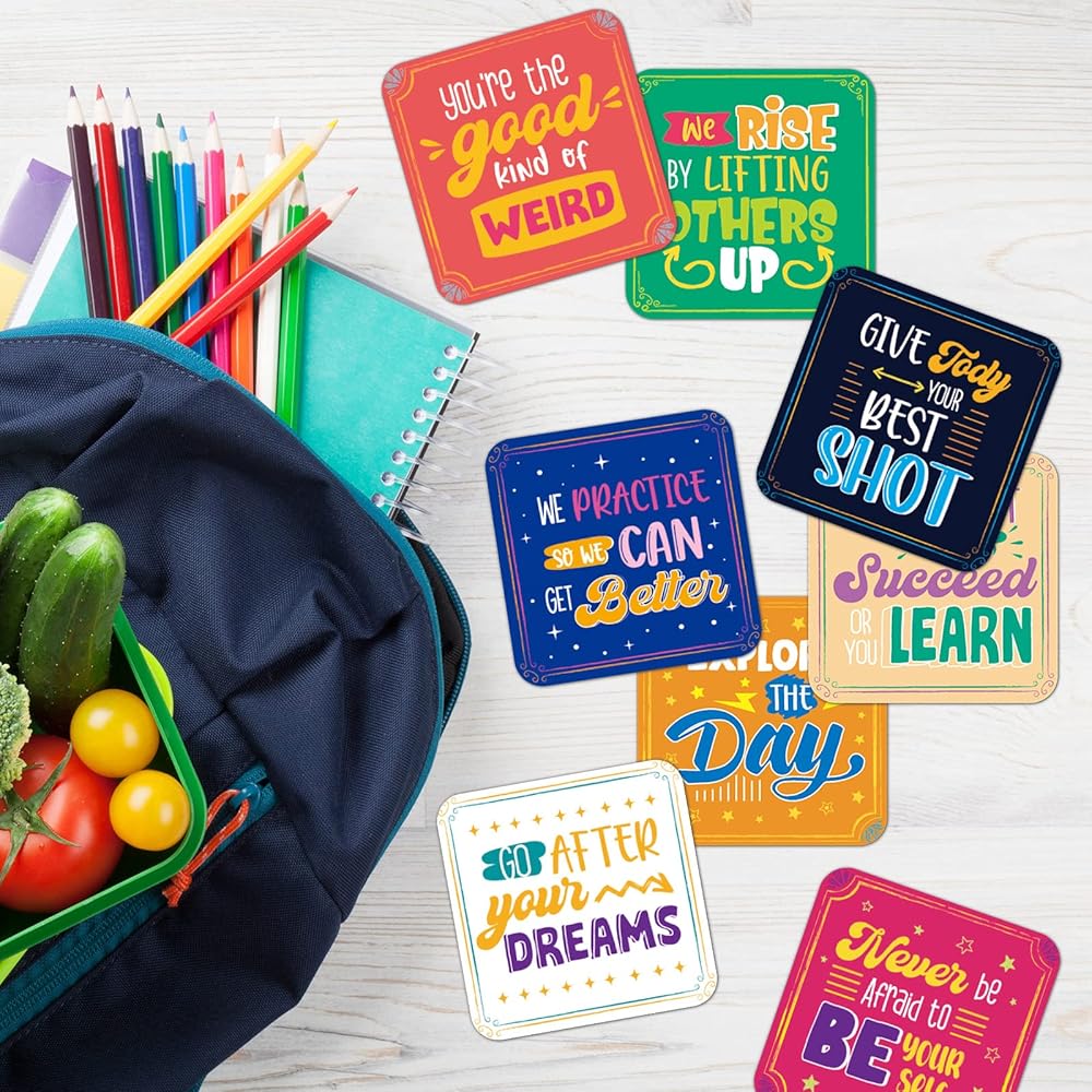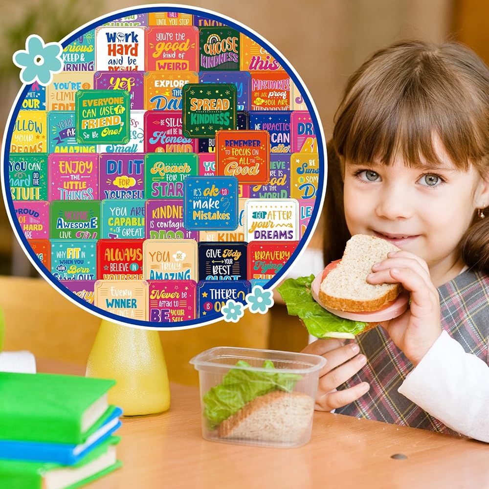 تصميم جميل: تم تصميم ملاحظات صندوق الغداء الخاص بنا للأطفال بـ 60 نمطًا مختلفًا وعبارة ملهمة، والتي يمكن أن تجلب للأطفال مزاجًا جيدًا في يومهم؛ الألوان الزاهية تتطابق بشكل متناغم معًا، مما يضيف المزيد من الحيوية إلى صندوق الغداء