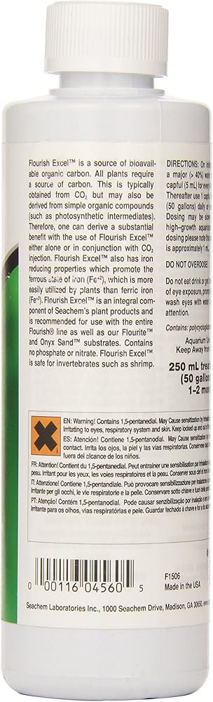 العلاج: عند استخدامه للمرة الأولى أو عند تغيير قدر كبير من المياه (> 40%)، استخدم كوبًا واحدًا من فلوريش اكسيل (5 مل) لكل 40 لتر (10 جالون US). بعد ذلك، استخدام 1 كوب لكل 200 لتر (50 جالون US) يوميًا أو كل يومين. للحصول على جرعات بحجم أصغر، يرجى العلم بأن كل علامة على الغطاء تشير إلى حوالي 1 مل.