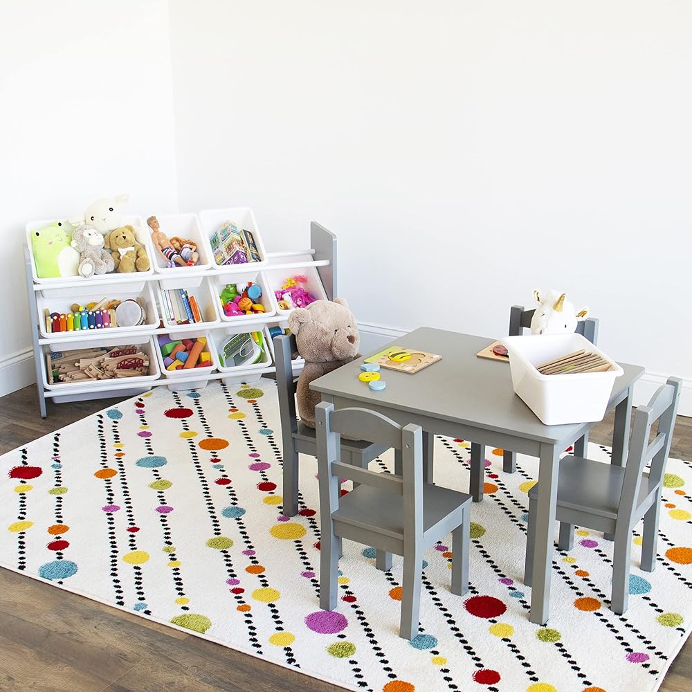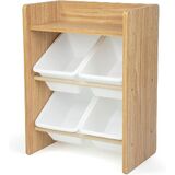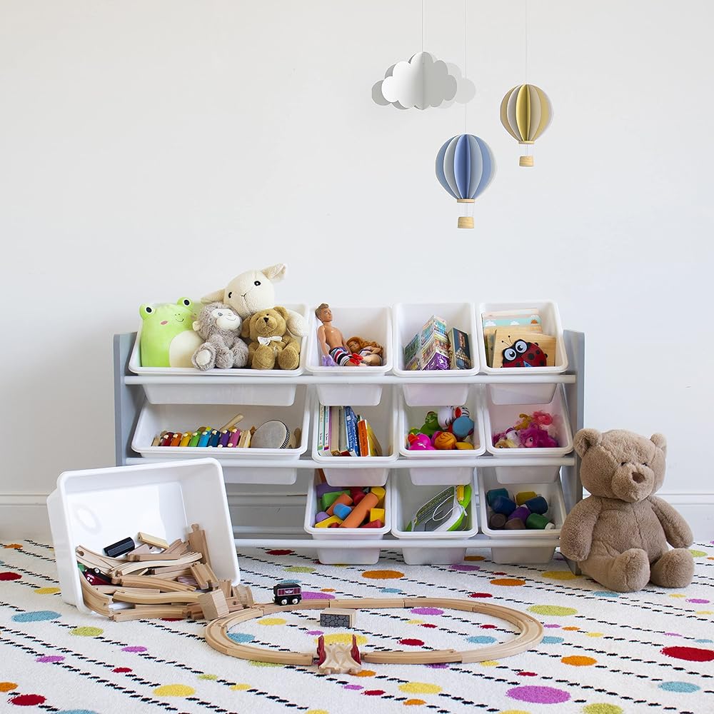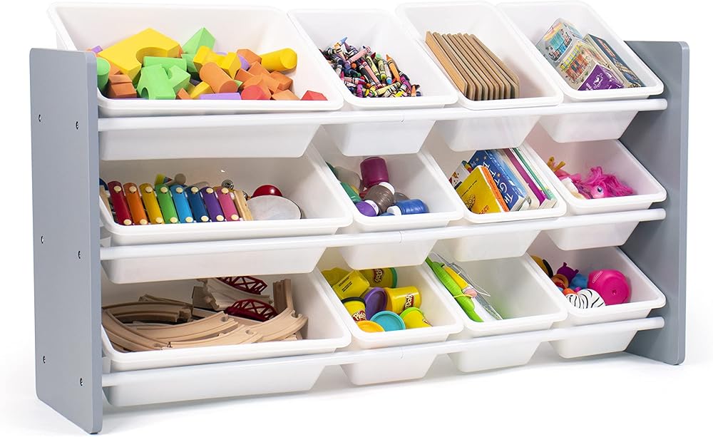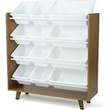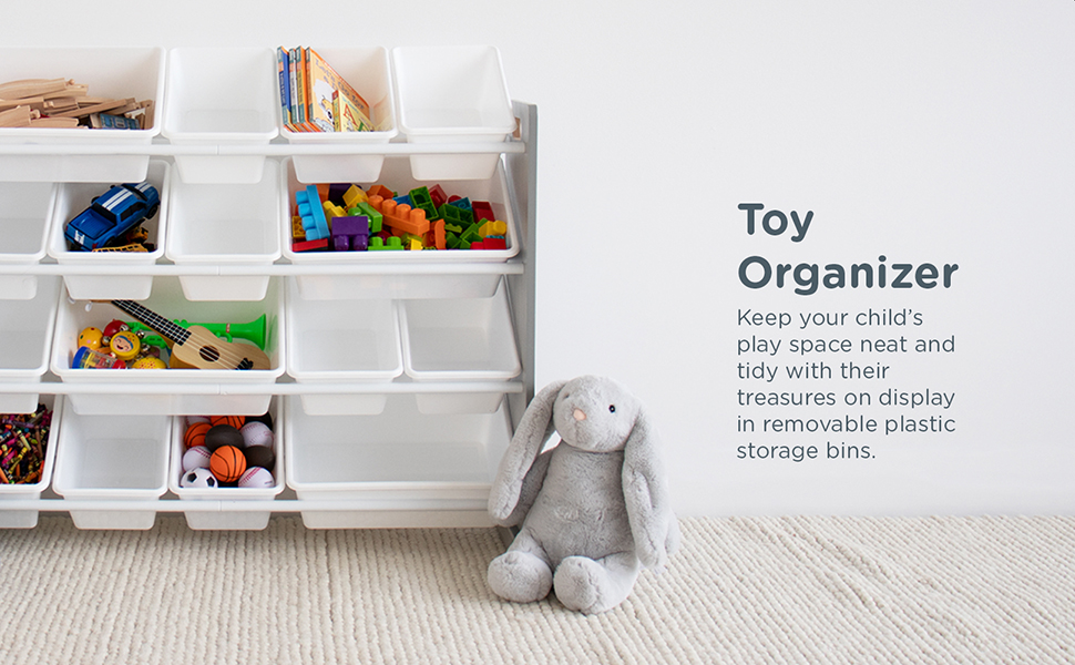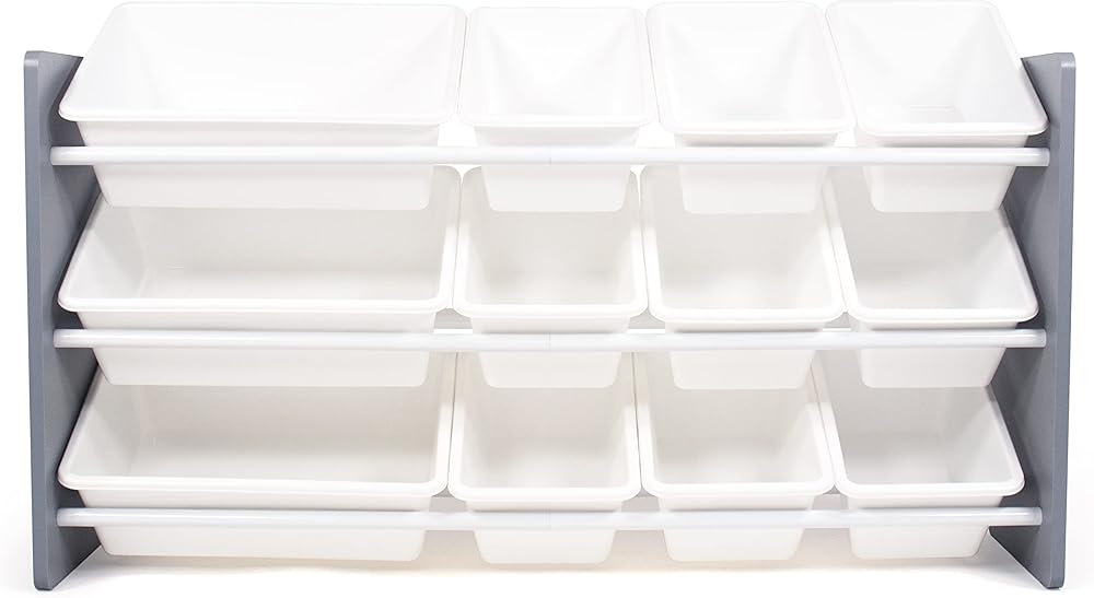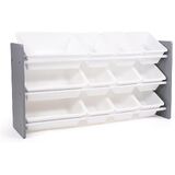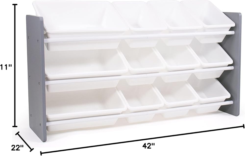 Playtime is more fun when your kids can easily take out their toys, books and games and then quickly clean up afterwards. The space-saving Humble Crew Made For Me Kids Toy Storage Organizer with 12 Storage Bins,s stows your children's toys in easy-to-see, easy-to-access BPA and phthalate free plastic storage bins. 8 standard and 4 large storage containers are easy to remove, replace and reposition along the 3 tiered shelves—sized just right within the toy organizer for toddlers and preschool-aged children. At just under two feet tall, this organizer is a great storage solution for small spaces and will fit perfectly under the kitchen island, table, or staircase! It makes a great toy box storage alternative, helping keep your little one's room clean and organized while at the same time teaching sorting and cognitive skills. The stylish colorway make this the perfect organizational solution for bedrooms, playrooms and more. Made with a sturdy engineered wood construction frame and steel shelving rods, each level can hold up to 30 pounds. Some assembly is required and all hardware is included. Product sizing – 42"W x 11"D (16"D with stabilizing braces) x 22"H Standard bin sizing: 12"L x 9"W x 6"H Large bin sizing: 16"L x 12"W x 6"H Additional plastic storage toy bins are also sold separately.