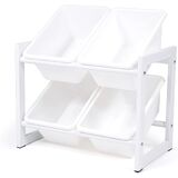 12 durable plastic storage bins, 8 standard and 4 large interchangeable storage bins. BPA and phthalate free.
