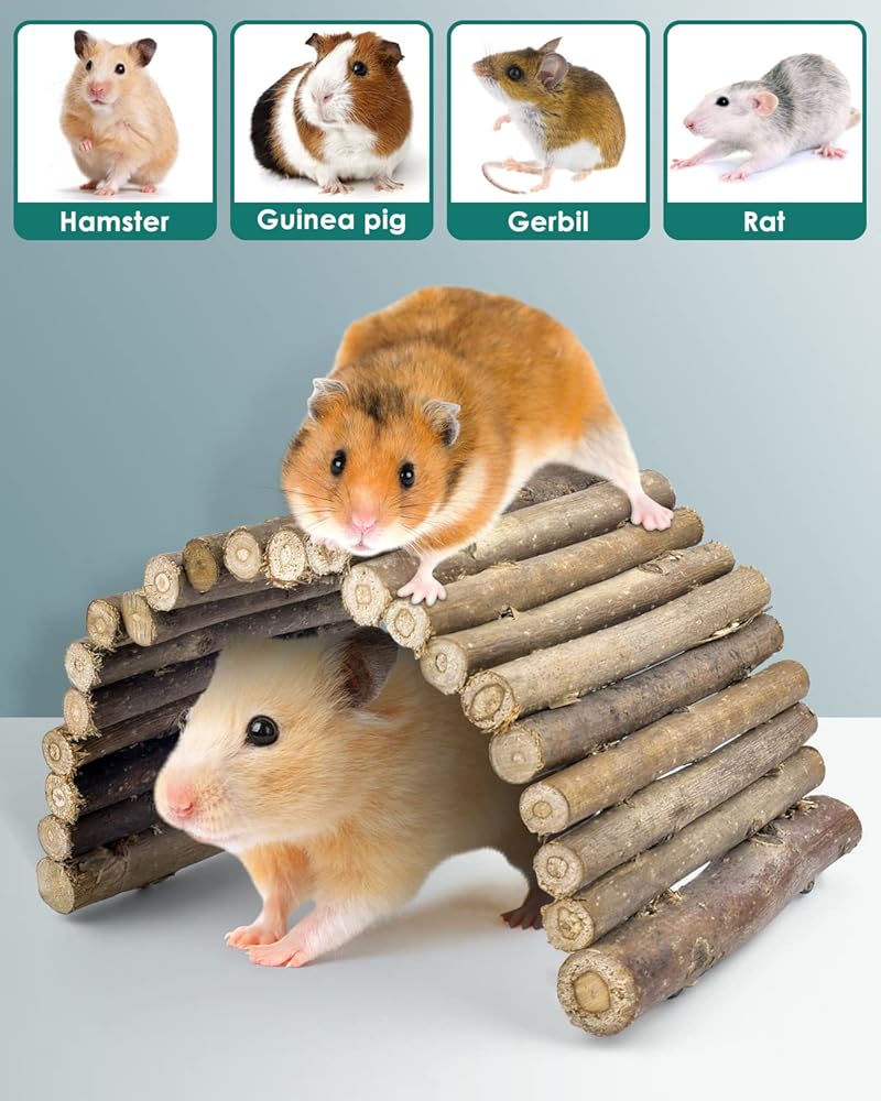 جسر قابل للانحناء - جسر الهامستر مصنوع من عصي شجرة البرقوق، مثبتة معًا بسلكين معدنيين مرنين، آمن للمضغ والتسلق. ينحني بسهولة لاستخدامه كجسر خشبي، ونفق، ومنحدر، وسياج، وخطوات، ومأوى للجربوع، ويشجع على استكشاف الحيوانات الأليفة وممارسة الرياضة.