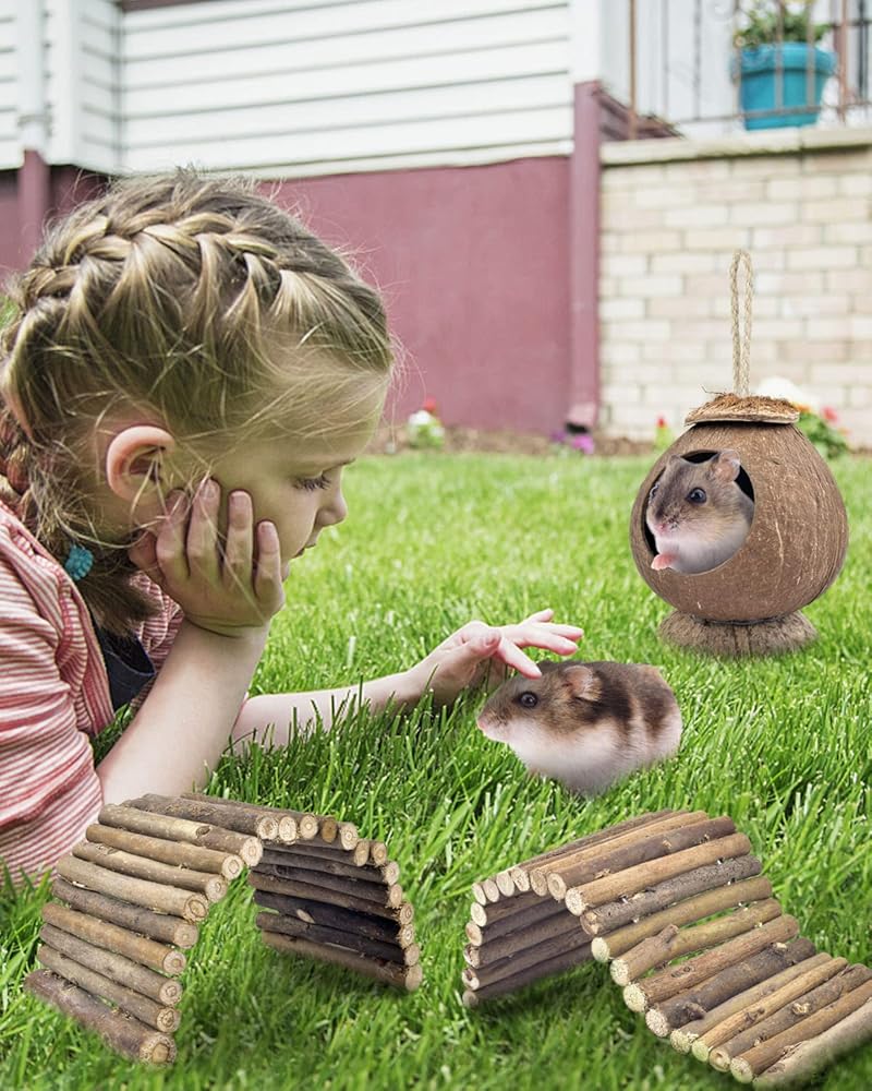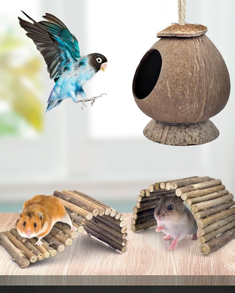 قائمة العبوة - مجموعة ألعاب الفئران المثالية تتضمن كوخ جوز الهند مع سلم، وجسر قابل للانحناء، ودراجة أحادية، وكرة الصفصاف، والأثقال، ومخروط الصنوبر، ولعبة مولار معلقة. يلبي الاحتياجات اليومية للهامستر واليربوع والفئران والفئران والهامستر السوري والهامستر القزم.