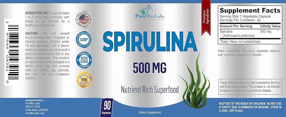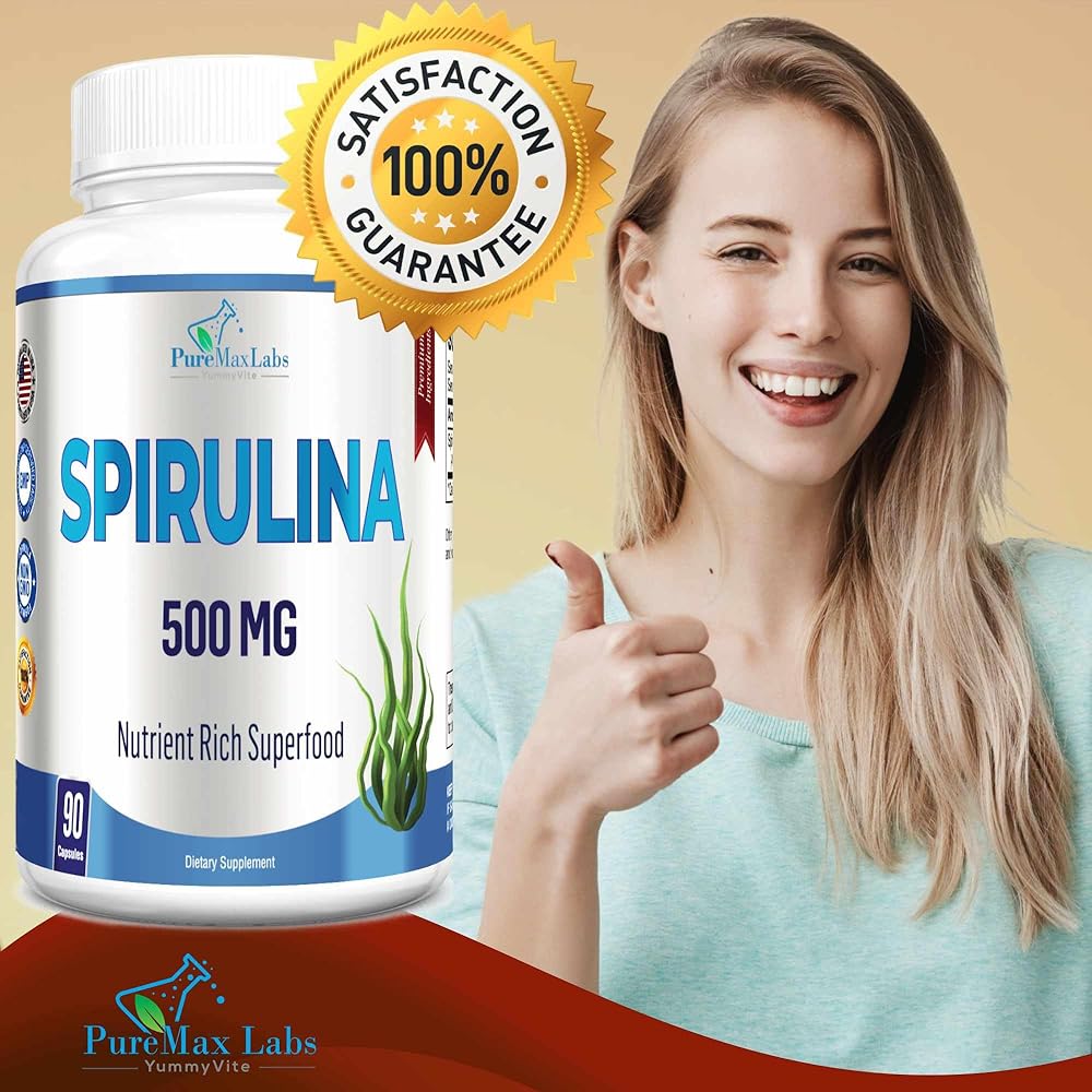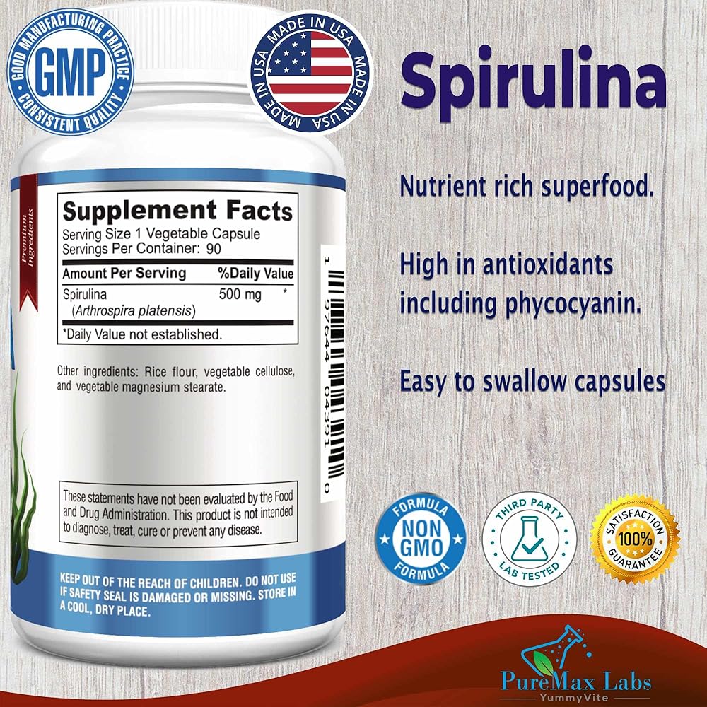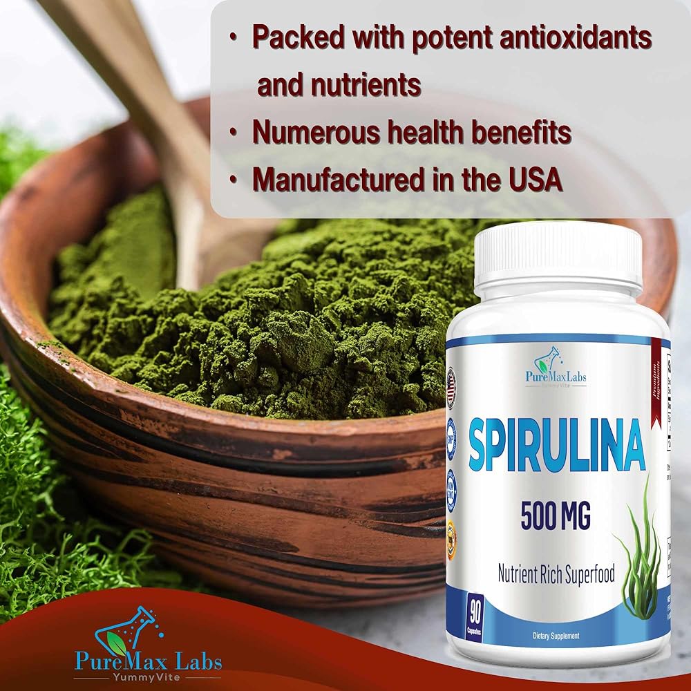 Introducing YummyVite's Spirulina Dietary Supplement, a powerhouse of nutrition brought to you by PureMax Labs. Our premium supplement is packed with 500mg of Spirulina per capsule, offering a convenient way to incorporate this superfood into your daily routine. Spirulina, a blue-green algae, is renowned for its rich nutrient profile. It's a fantastic source of protein, vitamins, minerals, and antioxidants, including phycocyanin, that can help support overall health and wellness. Our Spirulina supplement is designed to provide you with these benefits in a simple, easy-to-swallow capsule.