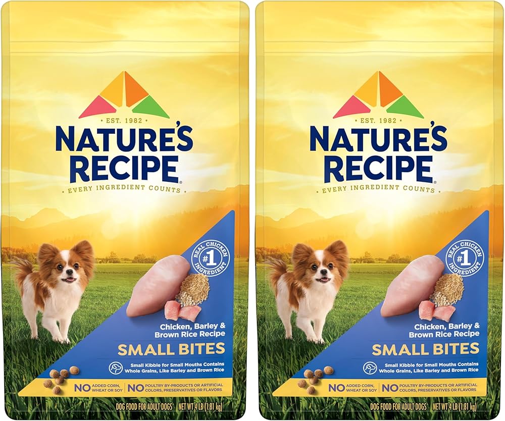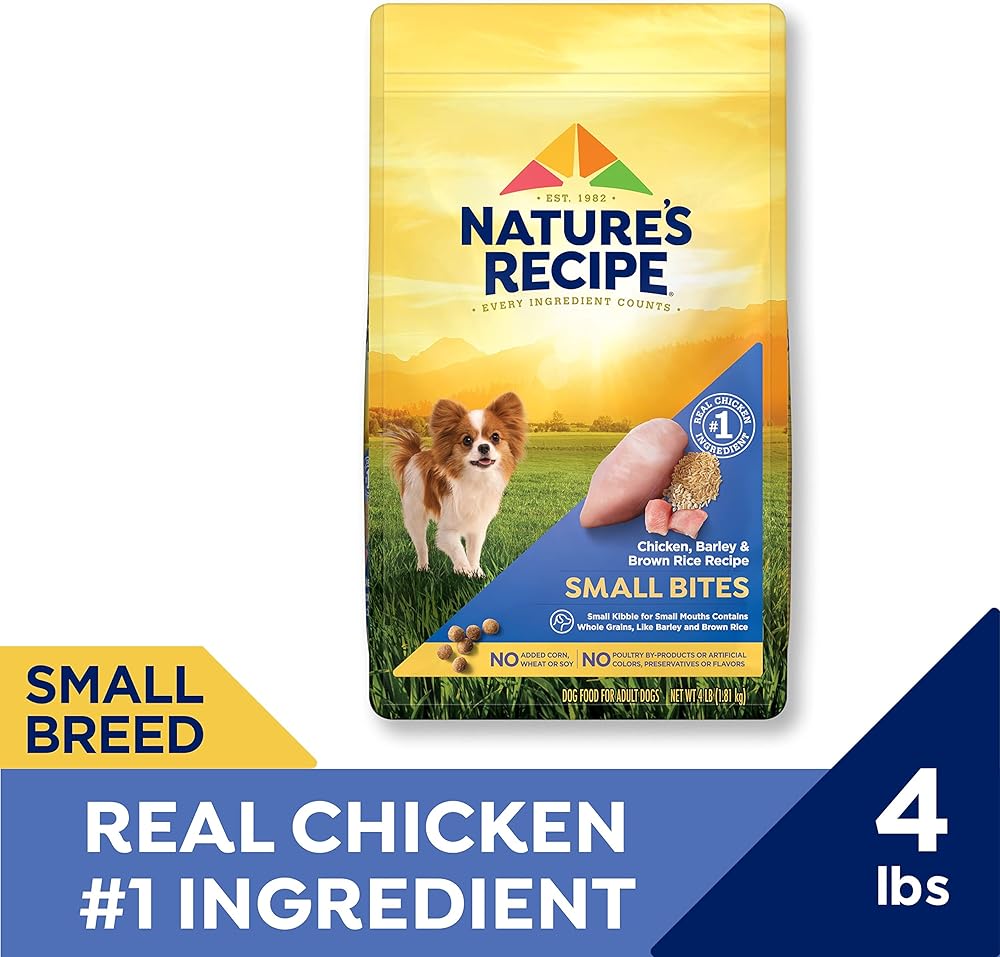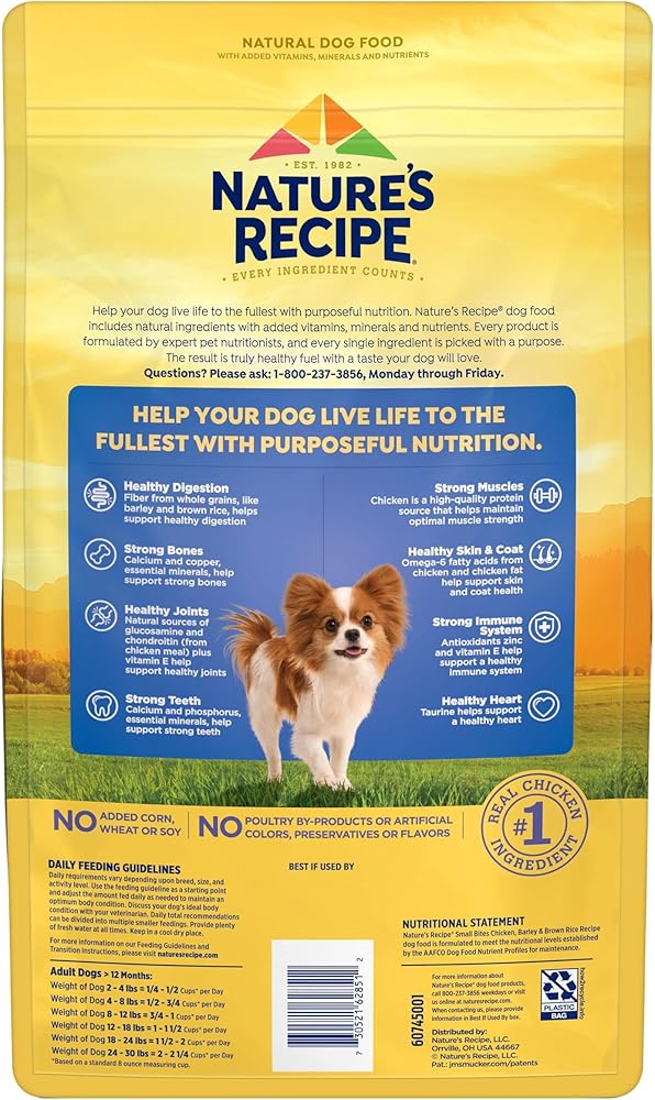 Fuel more wag-worthy adventures with wholesome ingredients dogs love — at a price you′ll love too. Nature′s Recipe dog food is formulated by expert pet nutritionists, and every single ingredient is picked with a purpose. The brand has been creating purposeful recipes for over 40 years. Nature′s Recipe Small Bites Chicken, Barley & Brown Recipe is a delicious, nutritious dry dog food for small dogs, made to help support their needs. Strong Muscles: Chicken is a high-quality protein source that helps maintain optimal muscle strength. Healthy Digestion: Fiber from whole grains, such as rice and barley, helps support healthy digestion. Healthy Skin and Coat: Omega-6 fatty acids from chicken and chicken fat help support skin and coat health. Strong Immune System: Antioxidants zinc and vitamin E help support a healthy immune system. Healthy Heart: Taurine helps support a healthy heart. Try this tasty, healthy dog food now to help your dog live life to the fullest.