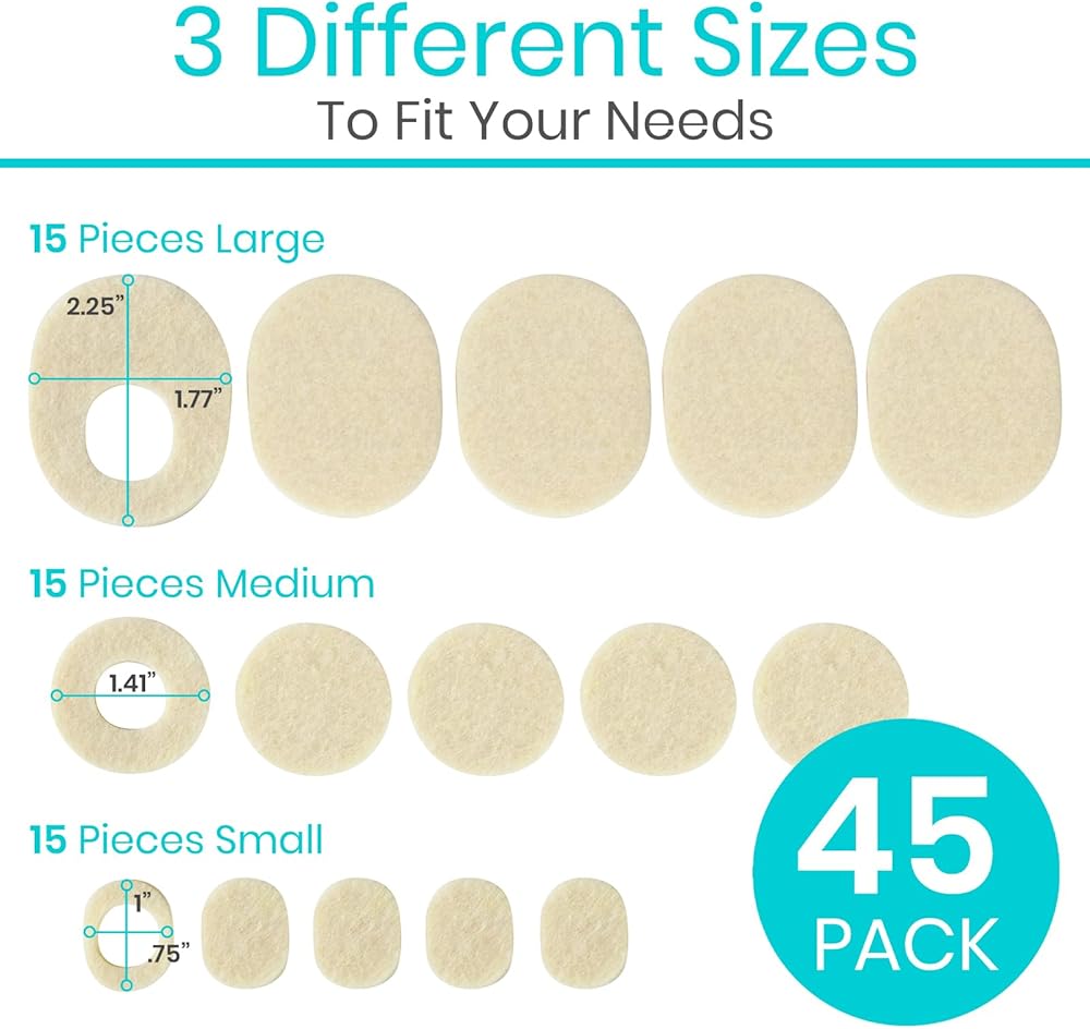 ناعمة بشكل مريح: مصنوعة من اللباد الطبي، وسائد الذرة الخاصة بنا ناعمة ومرنة لوضعها بشكل مثالي على أي منطقة من القدم أو إصبع القدم أو الكعب لتخفيف آلام القدم. كما أن وسادات اللباد الخاصة بنا رفيعة بما يكفي لارتدائها بشكل مريح مع أي نمط حذاء.