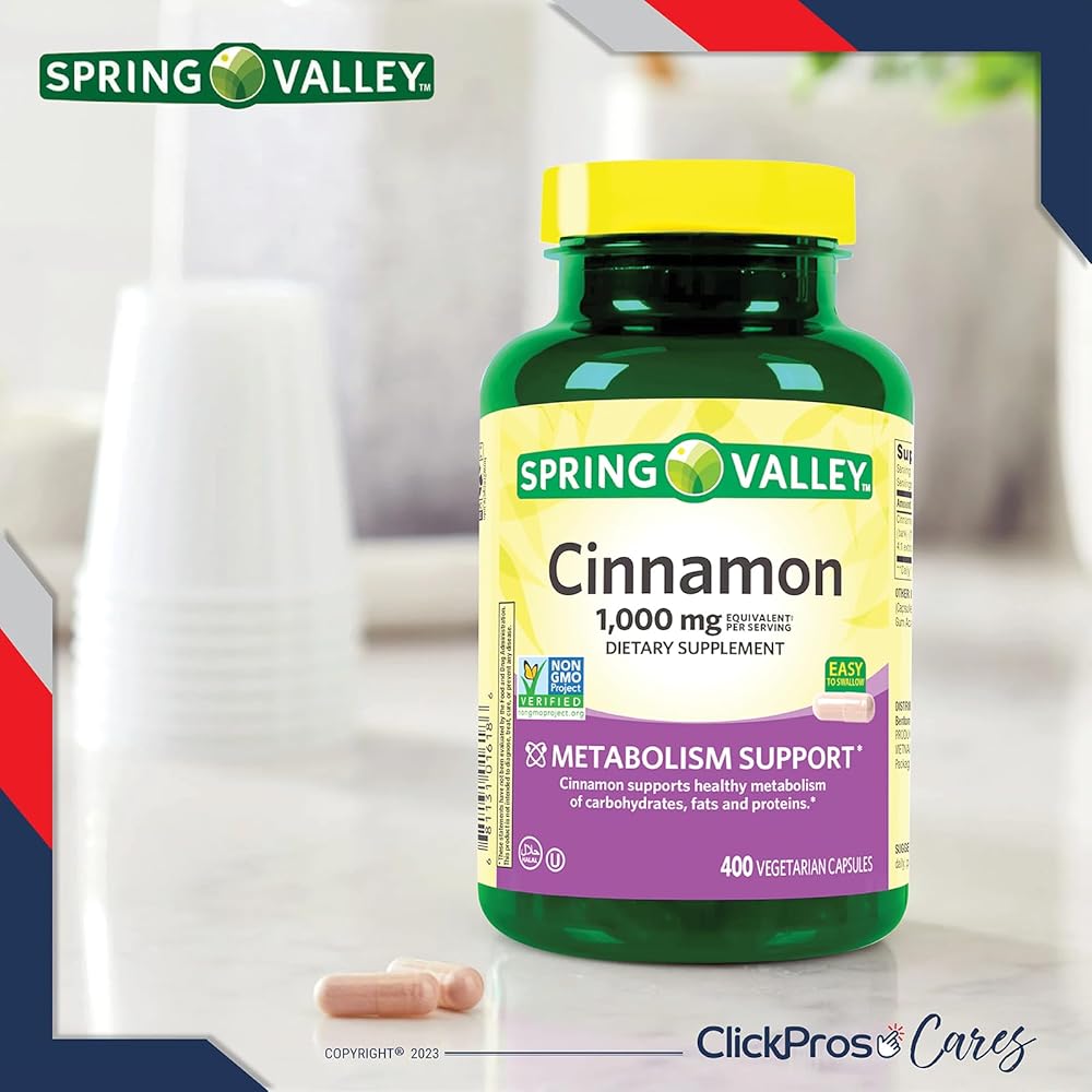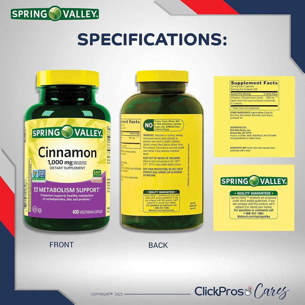 Spring Valley Cinnamon Dietary Support Vegetarian Capsules, 1000 mg, 400 Count - Spring Valley Cinnamon Dietary Supplement is a supplement designed to provide metabolism support to active individuals.* Cinnamon supports a healthy metabolism of carbohydrates, fats, and proteins.* Suggested adult dosage is two capsules daily, preferably with a meal. These tablets are free from gluten, yeast, wheat, milk or milk derivatives, lactose, sugar, and soy, and contain no artificial colors and flavors. You can rest assured that Spring Valley Cinnamon Dietary Supplement is produced with strict quality guidelines and backed by our quality guarantee. Spring Valley understands living a healthy, balanced lifestyle is the key to being your best self. With an affordable range of products inspired by nature, Spring Valley supports your and your family's health and holistic wellbeing. *These statements have not been evaluated by the Food and Drug Administration. This product is not intended to diagnose, treat, cure or prevent any disease. Includes Exclusive "The Truth About Vitamins" Guide designed and copyrighted by ClickPros to educate customers about vitamins and dietary supplements. Includes ClickPros convenient, portable, stainless steel Pill Container for your keychain. Any reproduction or use of this guide without the owner's consent is strictly prohibited. This rule is strictly enforced. All ClickPros Guides are not affiliated with Spring Valley. Spring Valley is a registered trademark.