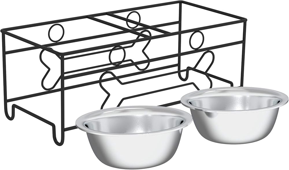 مجموعة من وعاءين مرتفعين للكلاب - أوعية كبيرة من الفولاذ المقاوم للصدأ بسعة 40 أونصة للطعام والماء للحيوانات الأليفة مع حامل مزخرف مرتفع بطول 3.5 بوصة من بيت ميكر، فضي/أسود