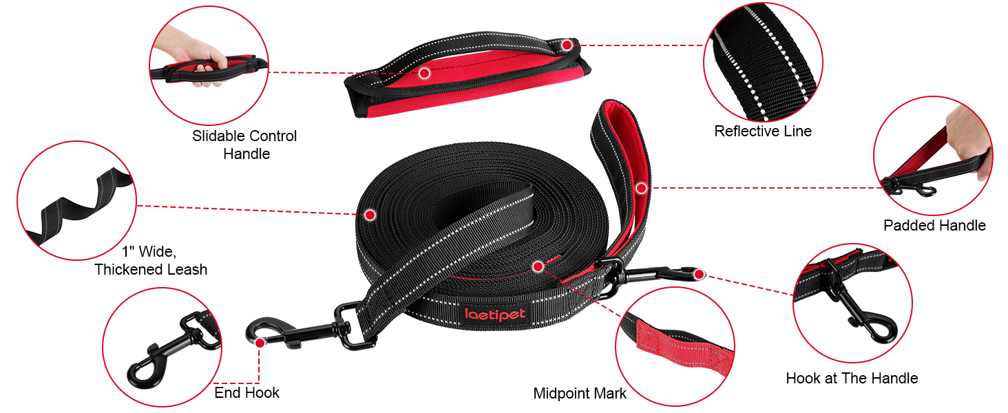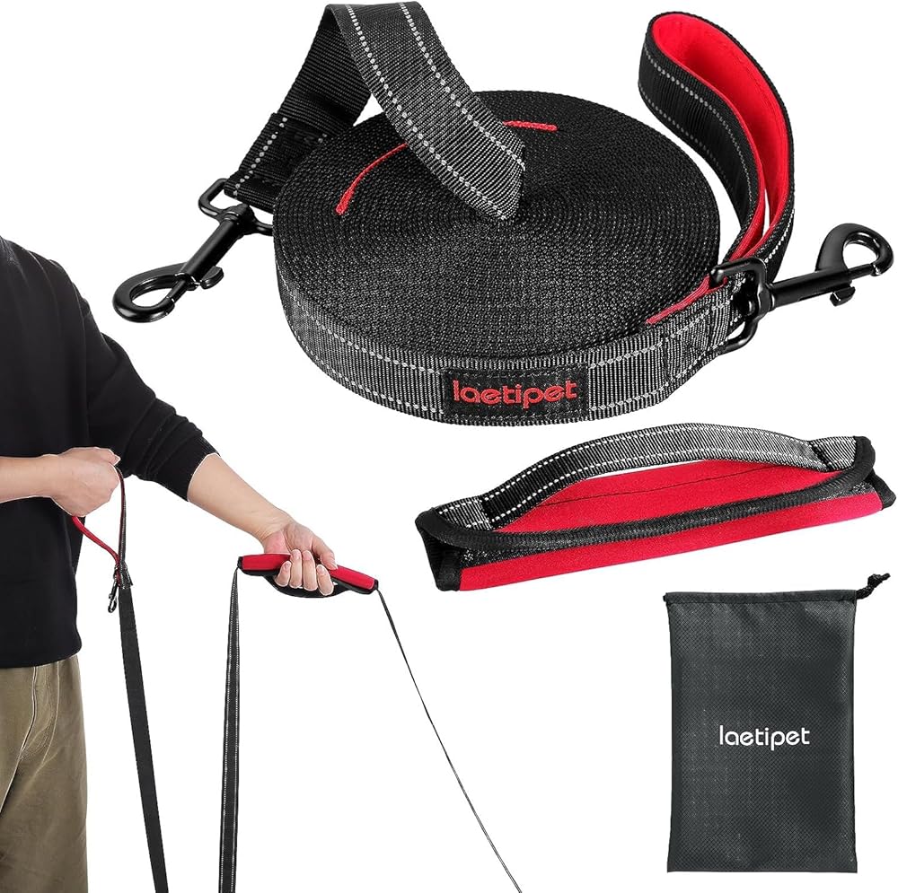 مقود كلب بطول 30 قدم من laetipet للتدريب مع مقبض تحكم، خط مقود طويل عالي التحمل لتدريب الجرو على الطاعة وخفة الحركة، تتضمن حقيبة تخزين مجانية، الأفضل للتدريب على اللعب والتخييم