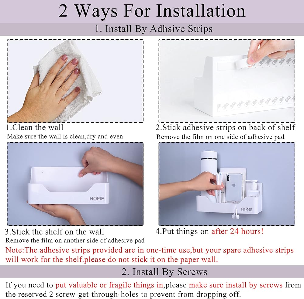 [سهل التركيب على الحائط] مع الأبعاد التقريبية 9.4 بوصة / 24 سم × 4.0 بوصة / 10 سم × 4.3 بوصة / 11 سم (طول × عرض × ارتفاع)، يأتي هذا الرف الأبيض مع شرائط لاصقة مزدوجة الجانب، يمكنك لصقها بسهولة وسريعة على الحائط بثبات في ثوانٍ ويقدم سعة تحميل قوية تبلغ 5.4 كجم. إذا كنت بحاجة إلى وزن أكثر أو بعض العناصر الثمينة أو معطرة ile، تأكد من قم بتثبيته بواسطة مسامير من الثقوب المسمار في الجانب الخلفي. (تحذير: يرجى عدم لصقها على ورق الحائط أو أن الجدار مبتل، وعثرة وبأتربة)