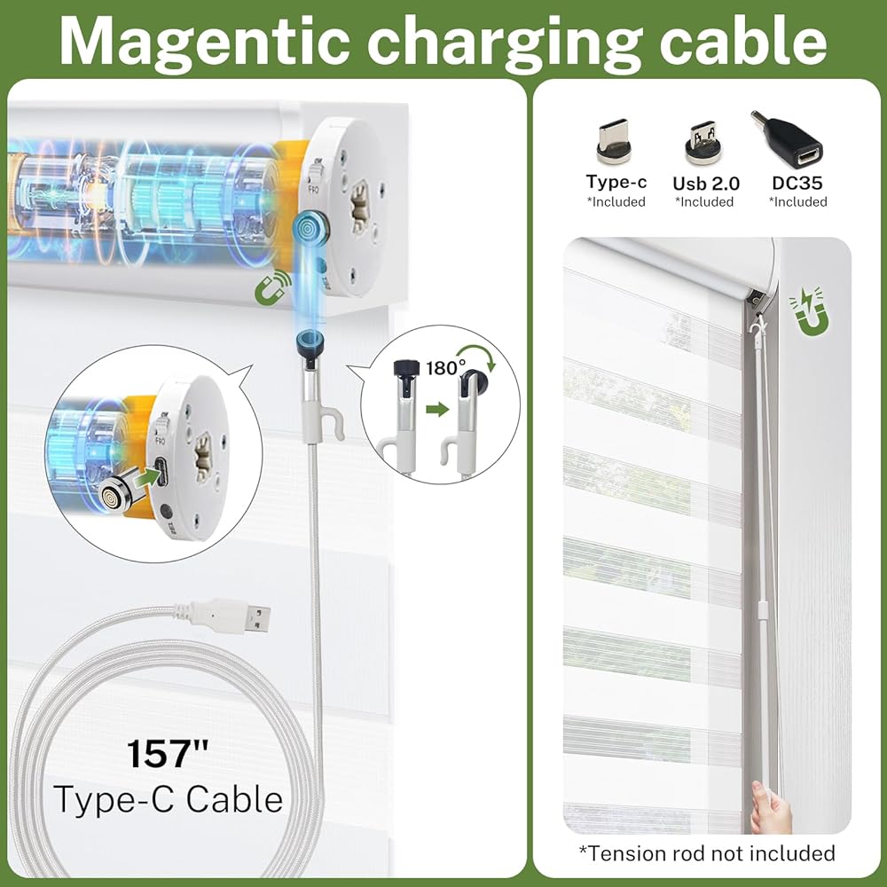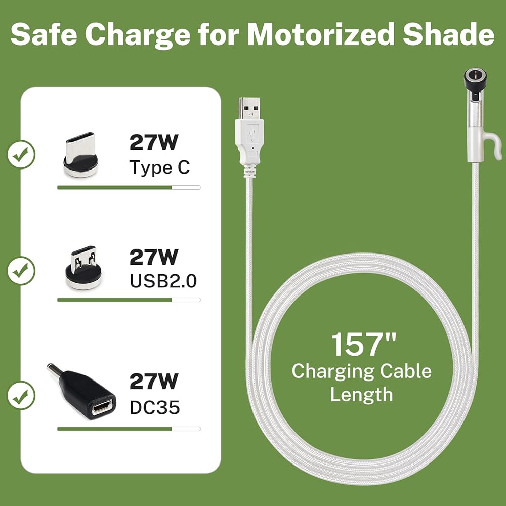 • 【Package included】In this magnetic charging cable package, you will get a 157" charging cable, Type-c charging head, USB 2.0 charging head and DC35 charging head. Meet the charging needs of different motorized shades.