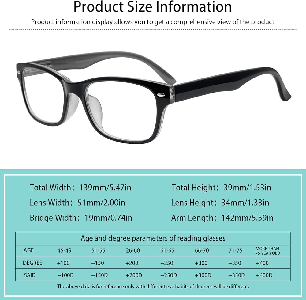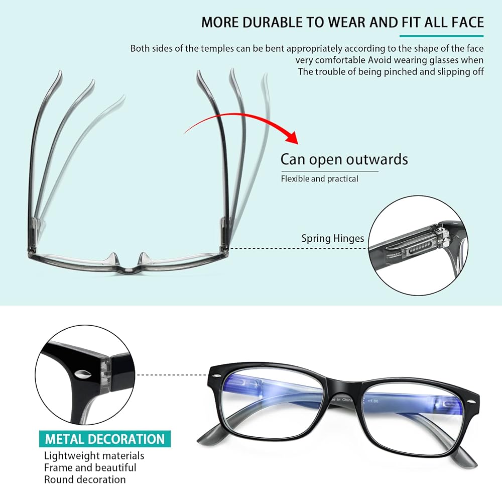 • 【قارئ مفصل زنبركي 】- مناسب لمعظم أنواع الوجه. سواء كان وجهك كبيرًا أو متوسطًا، فإنه يمكن أن يحل مشكلتك بسهولة. كما أن تصميم الساق الزنبركية القابلة للتأرجح بشكل تعسفي يقلل من ضغط النظارات على الرأس. حماية جيدة لعينيك ورأسك!