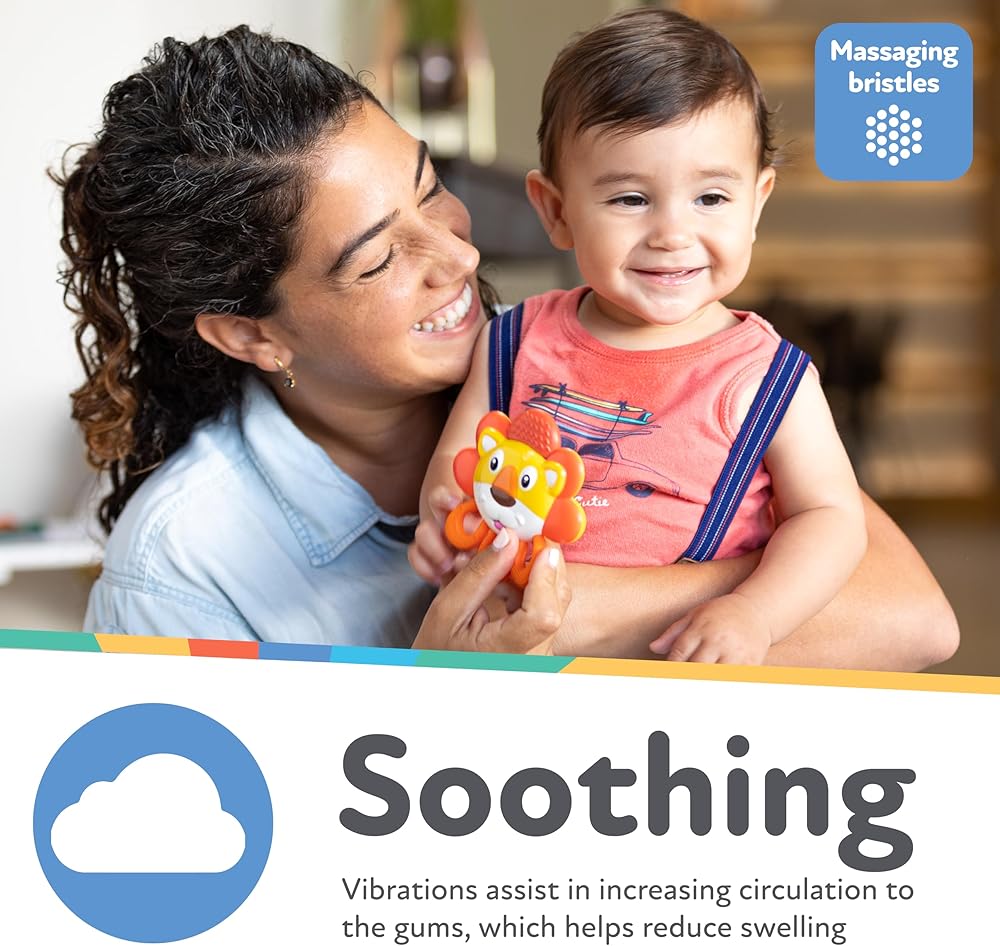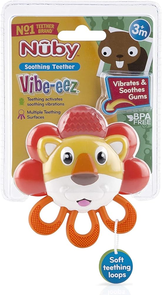 The vibe-eez vibrating teether by Nuby was designed to help increase circulation in your baby's swollen gums and reduce the discomfort and swelling associated with teething. As baby teethes down on the vibe-eez, it begins to gently vibrate to comfort baby as it soothes tender gums. These brightly colored characters will engage your child's senses and appeal to their imagination. The colorful shapes are easy for baby to hold and sized for maximum effectiveness as a teether and soother.