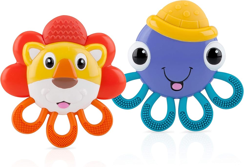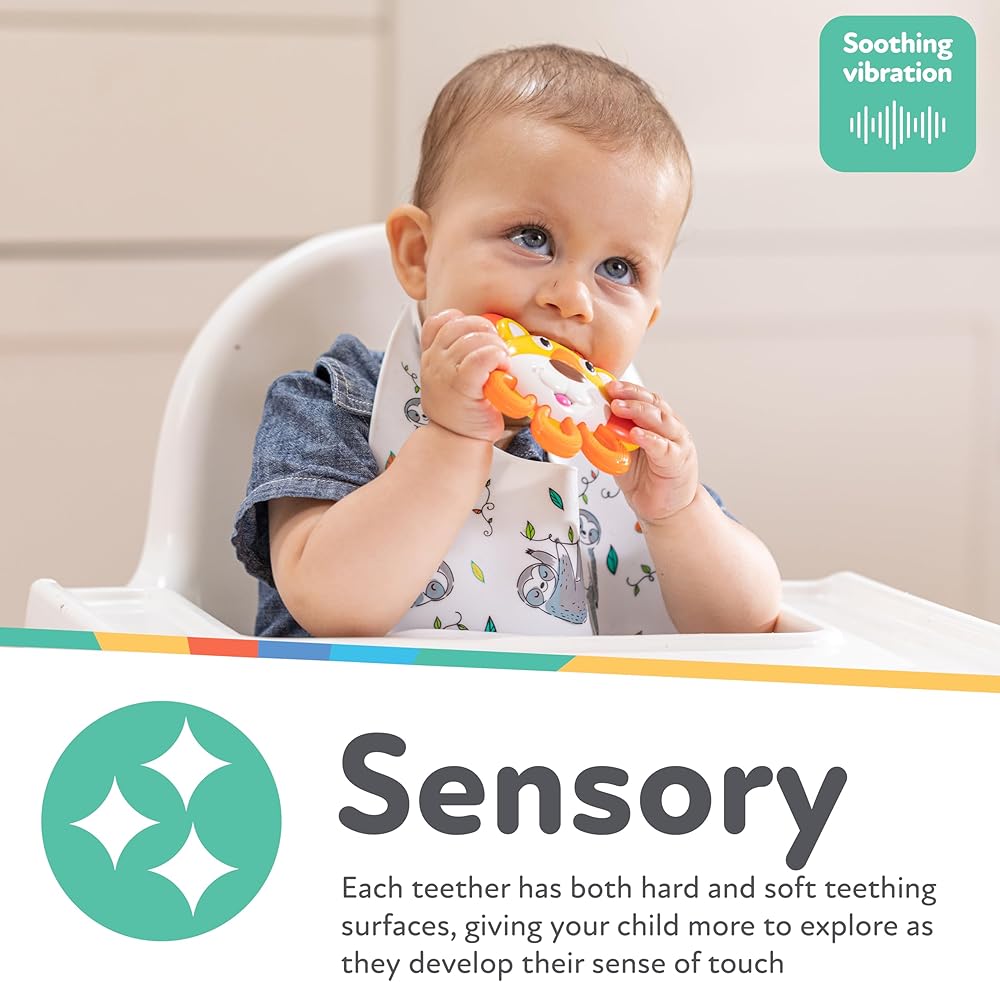 Each teether has both hard and soft teething surfaces, giving your child more to explore as they develop their sense of touch. The varied textures and patterns on the teethers also stimulate gums during teething.