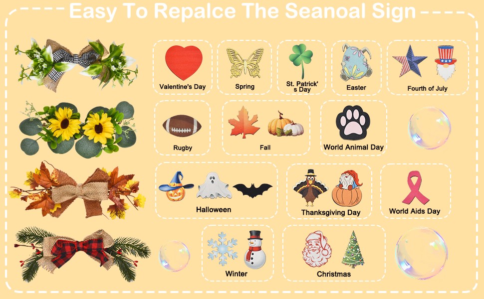 Easy to Hang - Comes with a durable twine hanger, making it simple and convenient to hang on your front door, porch, or entryway. It can meet all your holiday decor needs, eliminating the need to buy new decorations for every occasion. To use the sign, simply attach the Hook & Loop on the small icons and affix them to the board. You can easily replace the icons to match different seasons and holidays, making it a versatile and practical decoration for your doorway.