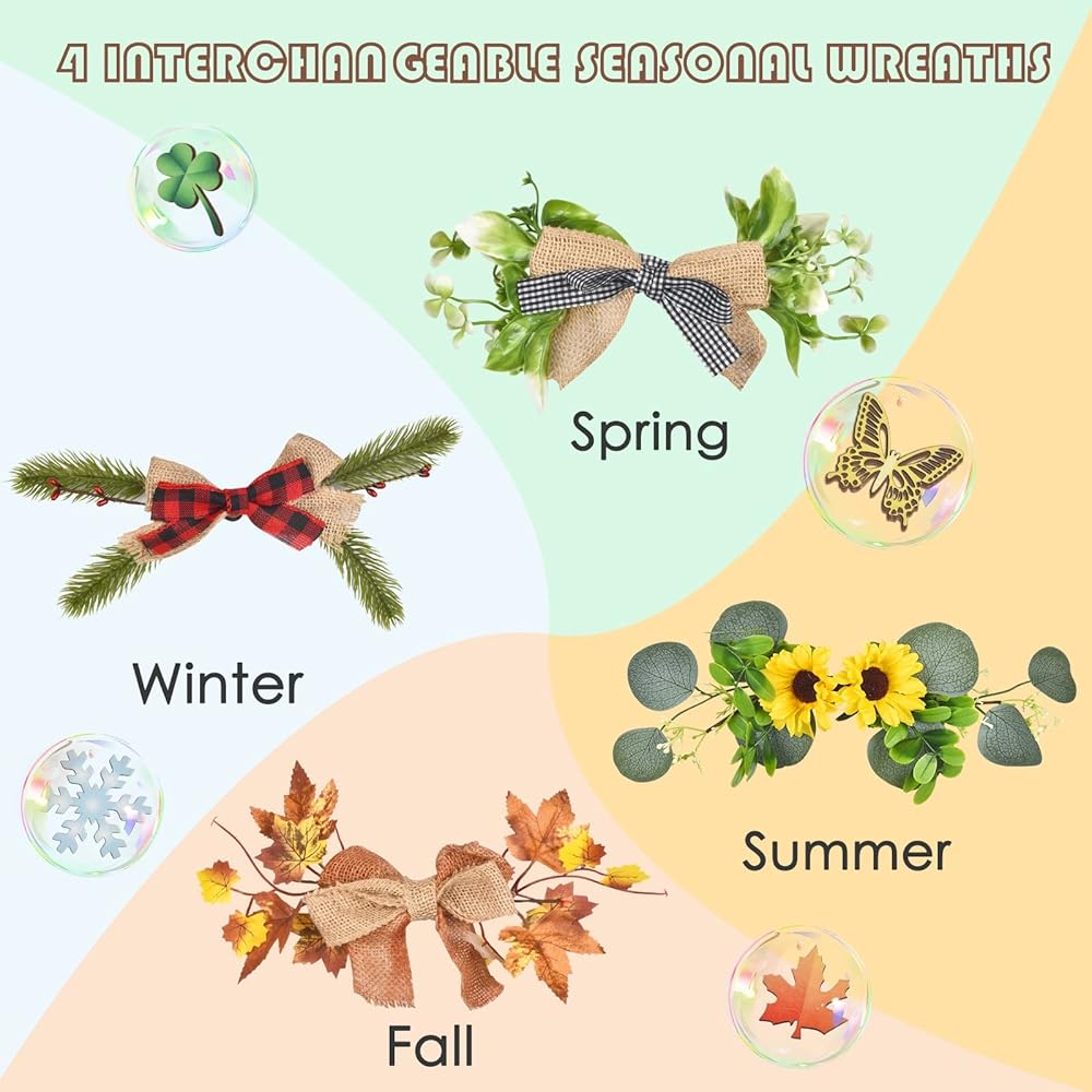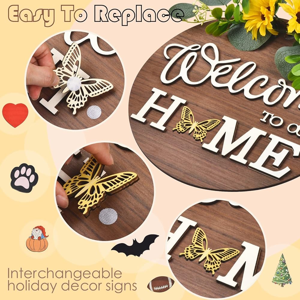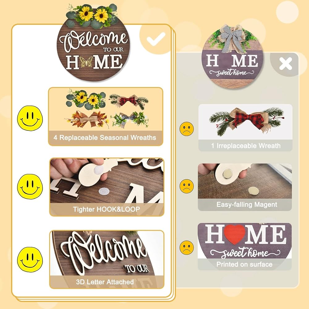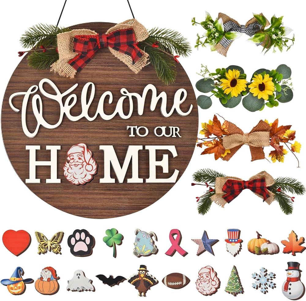 Welcome Sign for Front Door, Interchangeable Welcome Sign with 4 Seasonal Wreaths & 20 Customizable Icons, Rustic Wooden Welcome Home Sign - Perfect for Farmhouse Decor and Housewarming Gifts!