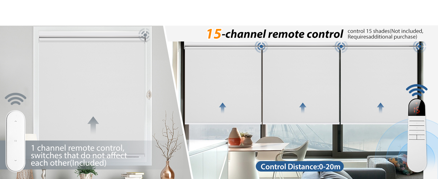 🍂【Remote Control】 A single-channel remote can control one roller blind. You can control the length of the curtain by remote control, which is simple and convenient to press and stop. if you need to control more than one curtain at a time(up to 15), you can choose the 15-channel.(B0CGHM23SM)