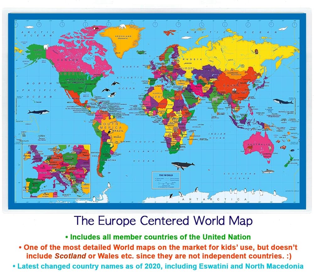 هذه الخرائط مفصلة ودقيقة، على الرغم من أنها مخصصة لاستخدام الأطفال بشكل أساسي. تُظهر خريطة الولايات المتحدة الأمريكية جميع عواصم الولايات وأكبر 50 منطقة مترو. وتضم أيضًا البحيرات العظمى وأكبر سلاسل الجبال وأكبر 10 أنهار في الولايات المتحدة الأمريكية. تحتوي خريطة العالم على مجموعة من أوروبا على نطاق أوسع، لتسهيل قراءة أسماء البلدان وعواصم المناطق الأكثر ازدحاما في العالم.