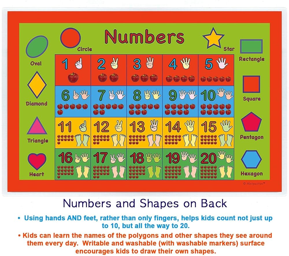 الأرقام والأشكال على الجانب العكسي توضح للأطفال كيفية العد حتى 20 على أصابع أيديهم وأصابع قدميهم، وأسماء المضلعات والأشكال الأساسية الأخرى.