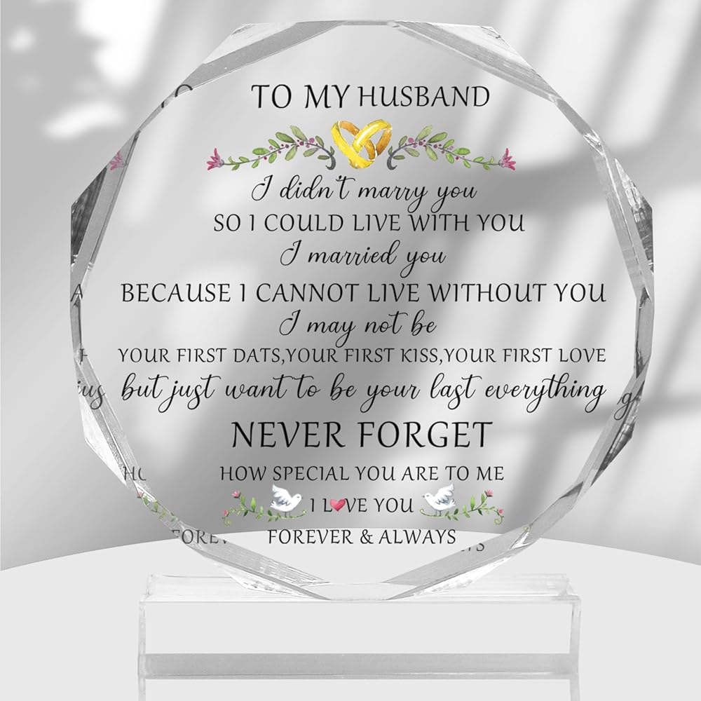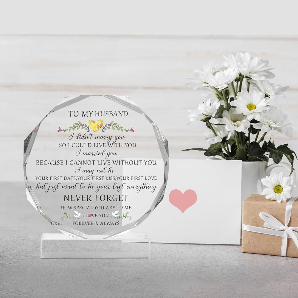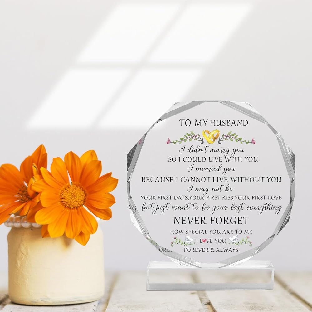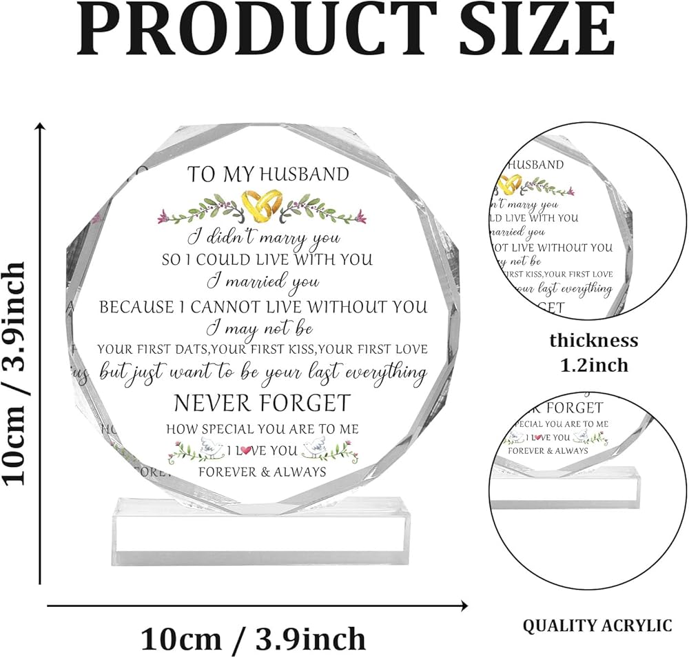 Product Description: You will receive a keepsake with an octagonal acrylic decoration. Its size is about 9.5cm * 11cm * 1.4cm / 3.74in * 4.33in * 0.55in, it has a flat base and the length is 8.5cm / 3.34”. It is perfect gift for husband, men, partner, boyfriend on Birthdays, anniversaries, weddings, Christmas, Valentine's Day, or any other special occasions. The beautiful acrylic engraved sign is an elegant and delicate ornament for your home, office, bedroom, living room, kitchen, school, dormitory study, bathroom, cloakroom, table, shelf, fireplace, nightstand and other places, bringing a pleasant visual experience.