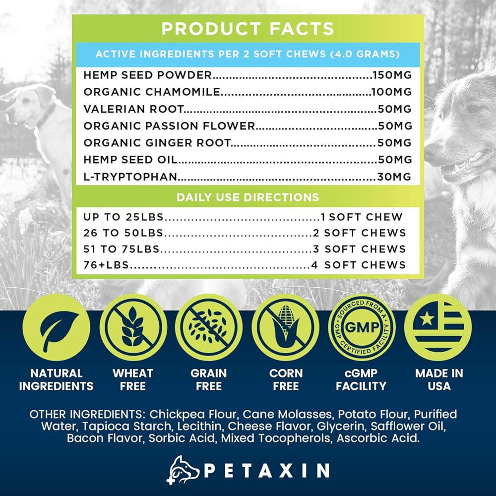 Happy Dogs Promise: Petaxin began with our team's love for our pets and our passion for wanting to help them live their healthiest lives possible. Petaxin's mission is to create products like this calming treat supplement for dogs that keep your pet sniffing, barking, and wagging.
