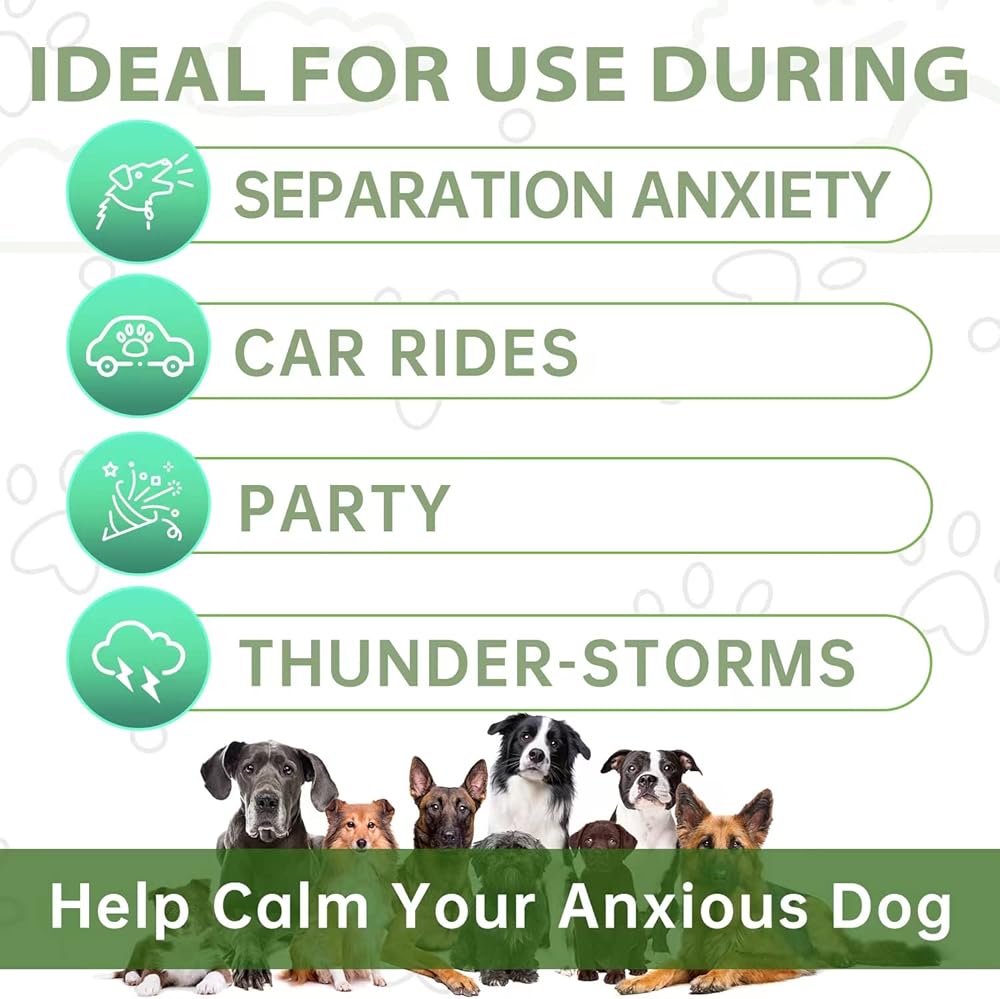 تركيبة بيطرية - مضغ مهدئ للكلاب تم تطويره بواسطة طبيب بيطري للمساعدة في تهدئة وتخفيف القلق للكلاب. إنه حل طبيعي وآمن وفعال للنباح الذي لا يمكن السيطرة عليه، والاهتزاز، والخدش، والعواء، وفرط النشاط، وقلق انفصال الكلاب، وركوب السيارات، والألعاب النارية، والسفر، وزيارات الطبيب البيطري ومربية الحيوانات. مثالية للكلاب ذات السلوكيات المدمرة أو النفور من الضوضاء أو القلق العام.