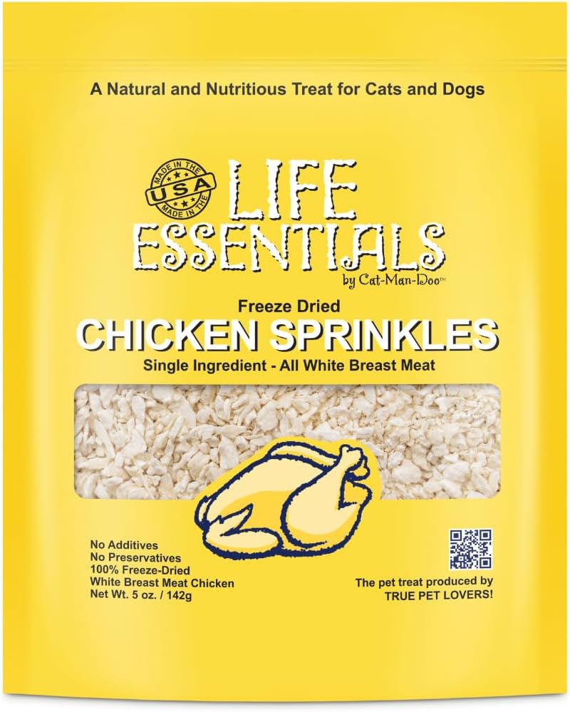 All Life Essentials products are part of the trustworthy Cat-Man-Doo brand. This human grade, all white breast meat is carefully sliced into strips. The strips are then fully cooked and then perfectly freeze dried without the use of chemicals, additives or preservatives. This is a single ingredient treat free of grains and fillers. It is low in fat, calories and carbohydrates so it won't contribute to weight gain like biscuits and other high calorie treats. There are approximately 70 calories in ONE OUNCE of chicken. These scrumptious bites are a healthy daily snack. They make a fantastic training treat for dogs and even the most finicky cats will love them. You can feel great each time you reward your treasured four-legged family member with Life Essentials Freeze Dried Chicken Sprinkles. Proudly packaged in the USA. THE PET TREATS PRODUCED BY TRUE PET LOVERS!