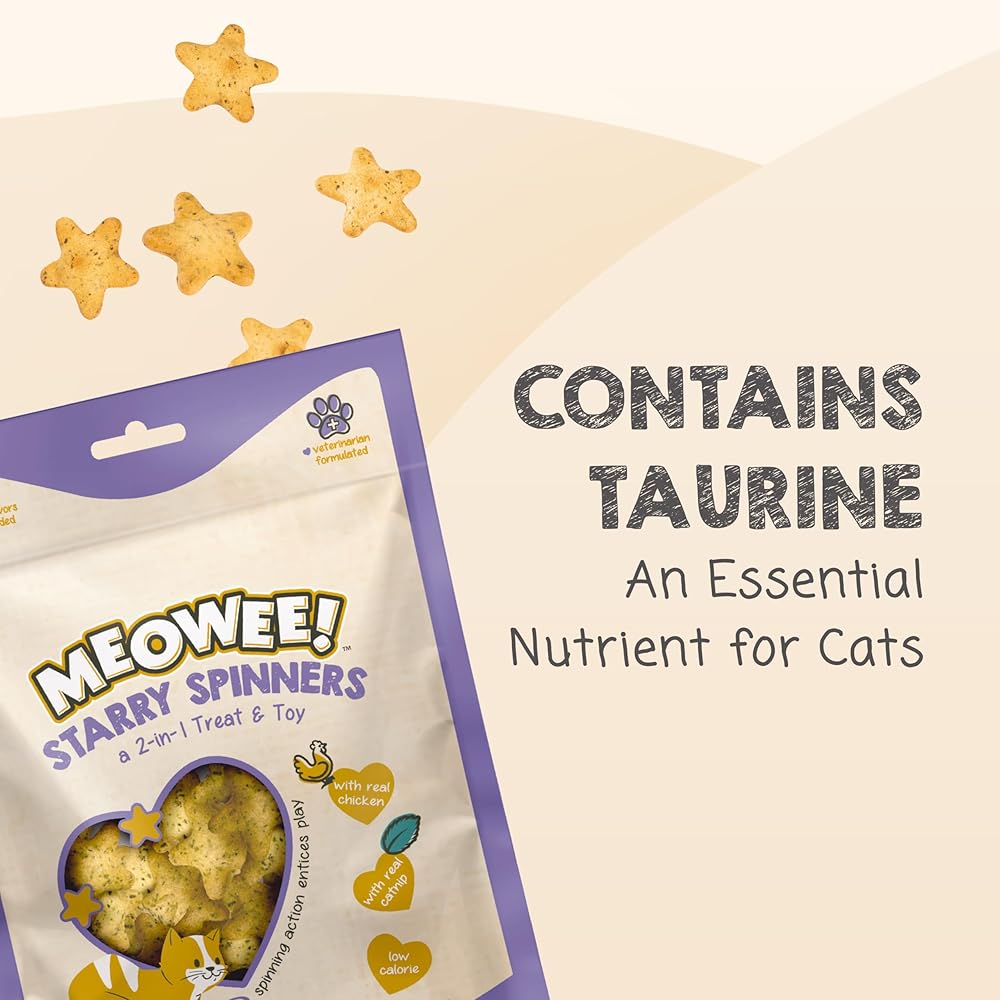 MEOWEE! cat treats let you bond with your favorite feline through playful, interactive treats. Treat your cat with playful Starry Spinners! A good source of protein and low calorie, these spinning treats are made with a savory combination of flavors cats love – real chicken, chicken liver and catnip. The tasty flavors are just the beginning! The fun shape and catnip encourage play and activity. This tasty, interactive treat takes playtime to another level! Plus, these treats are veterinarian-formulated and contain taurine – an essential nutrient for cats. You'll also love that they are made with no artificial flavors or colors added. Feed up to 4 treats per day for an average size adult cat. Intended for intermittent or supplemental feeding only.
