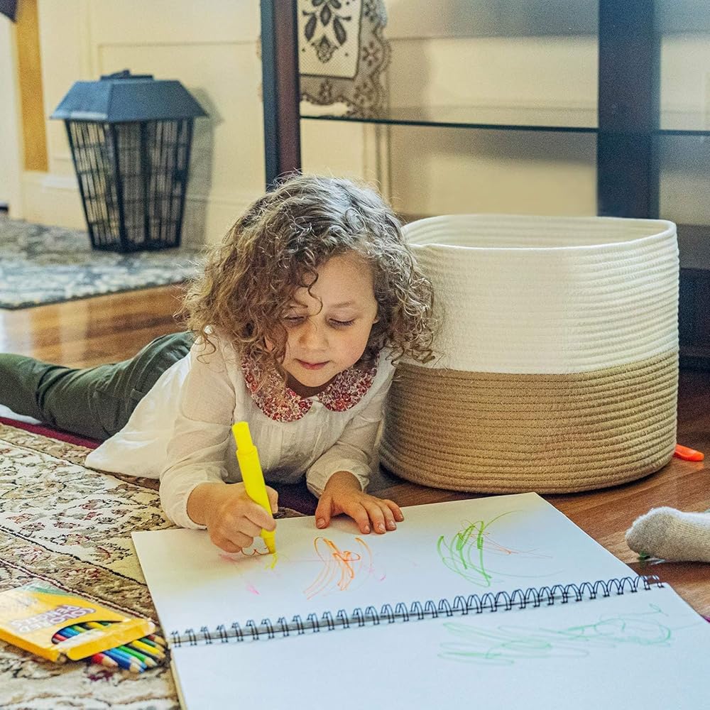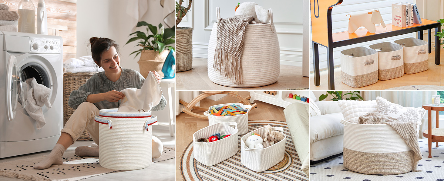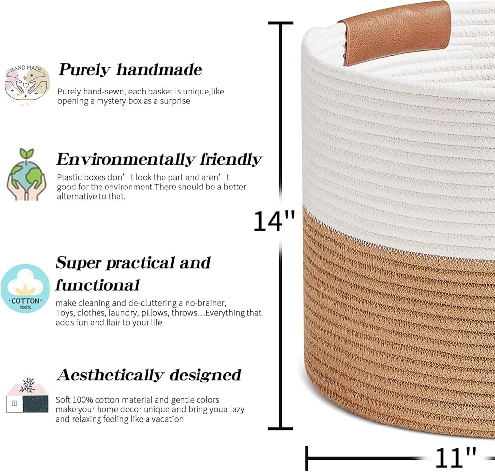 【خامة عالية الجودة، ناعمة ومتينة】السلة المنسوجة مصنوعة من حبال قطنية منسوجة طبيعية، بدون رائحة كيميائية. نظرًا لجودة الصناعة، لا توجد أسطح حادة أو صلبة على هذه السلة المنسوجة، لذلك يمكن استخدامها لأطفالك وأطفالك وحيواناتك الأليفة. المادة الجديدة المطورة لعام 2020 تجعل السلة أقوى وتسهل العودة إلى شكلها الأصلي، وتظل مستقيمة حتى بعد طيها وحفظها لفترة طويلة.