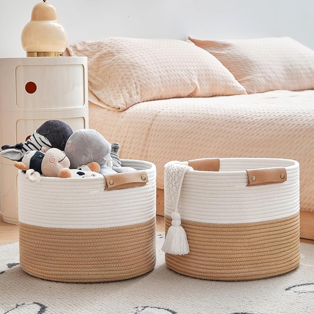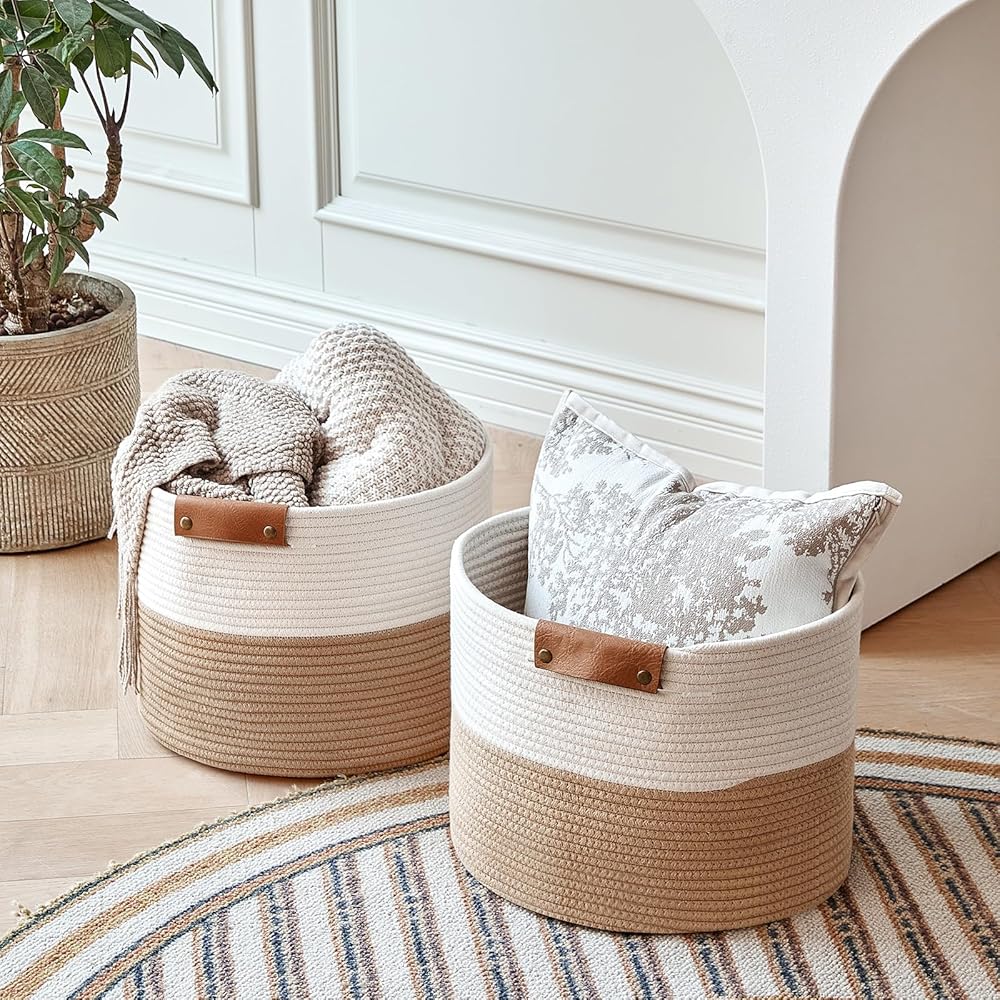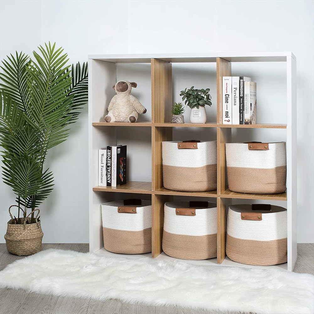 【تصميم حديث وديكور منزلي】تصميم بلونين أبيض وكاكي يمكن أن يتوافق مع أي ديكور. شكل ناعم ورقيق مناسب لمطابقة أي أثاث. يمكن استخدام سلة التخزين المنسوجة في كل غرفة. يمكن وضعها في رياض الأطفال، وغرفة النوم، والحمام، وغرفة الغسيل، والشرفة، وصالة الألعاب الرياضية، وما إلى ذلك. ويمكن استخدامها أيضًا كسلال رفوف في أرفف الكتب المكعبة، والخزائن، وما إلى ذلك. مثالية لديكور الغرفة الحديث والبسيط والرعوي والعتيق!