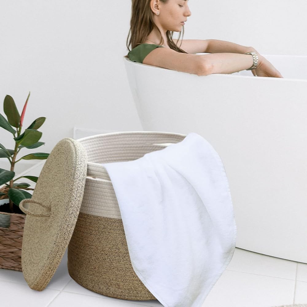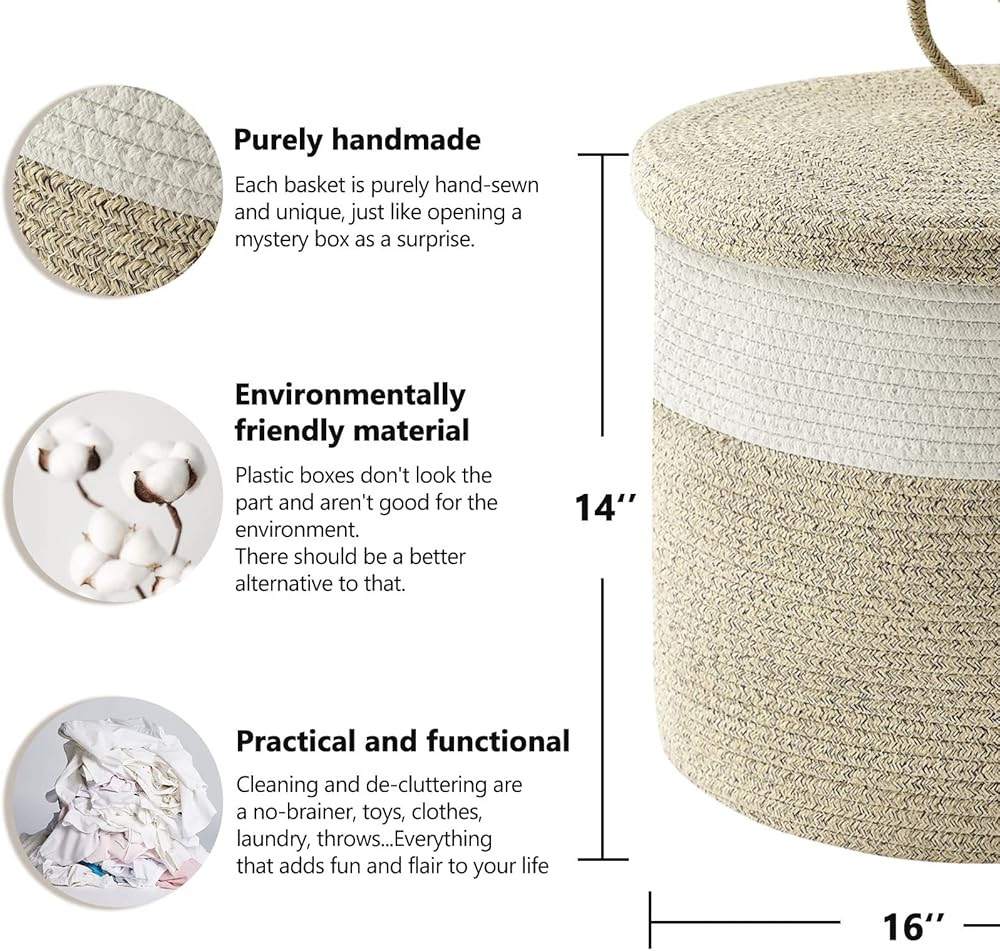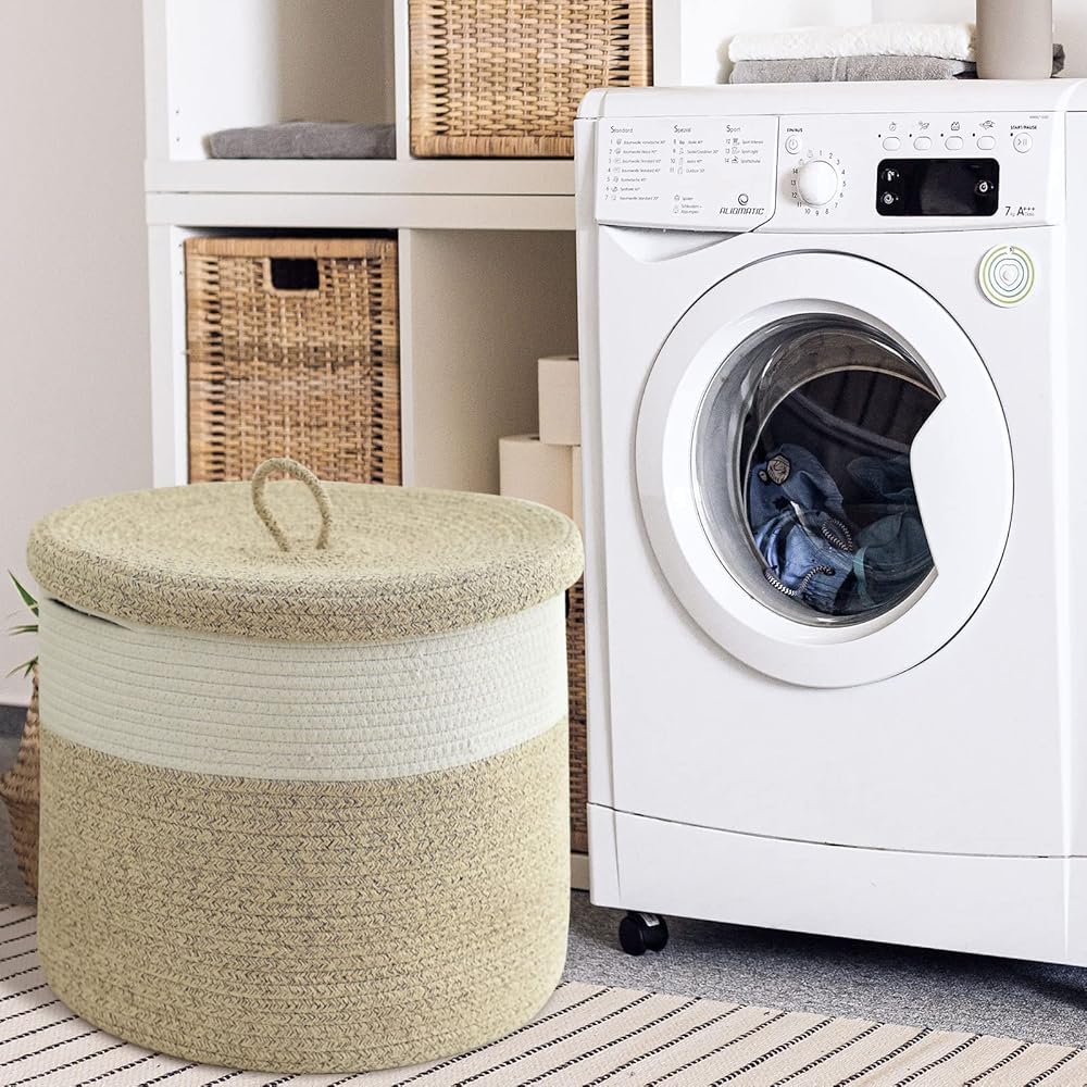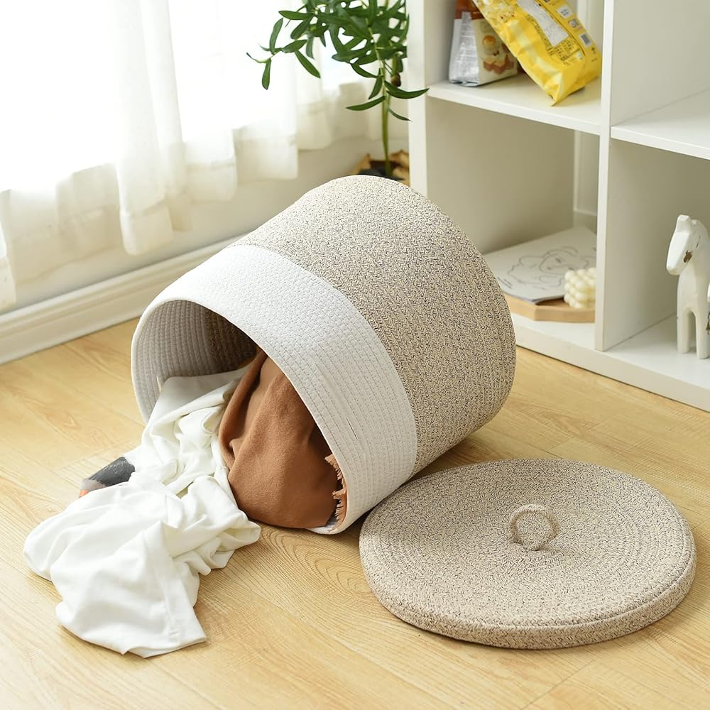 خامة فاخرة: مصنوعة من حبل منسوج بخيوط قطنية. سلة غسيل بمقابض وغطاء قويين، متينة وناعمة لذا فإن تحريك سلة الحبال المنسوجة سهل ويمكن وضعها في أي مكان في المنزل.