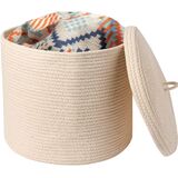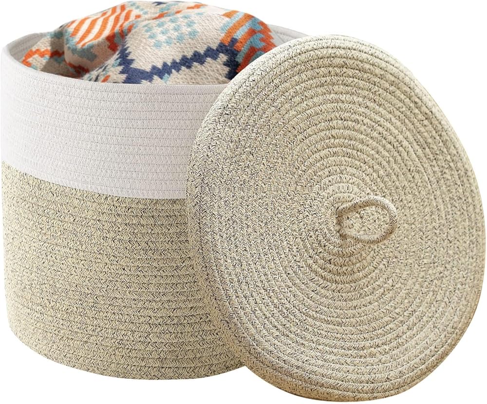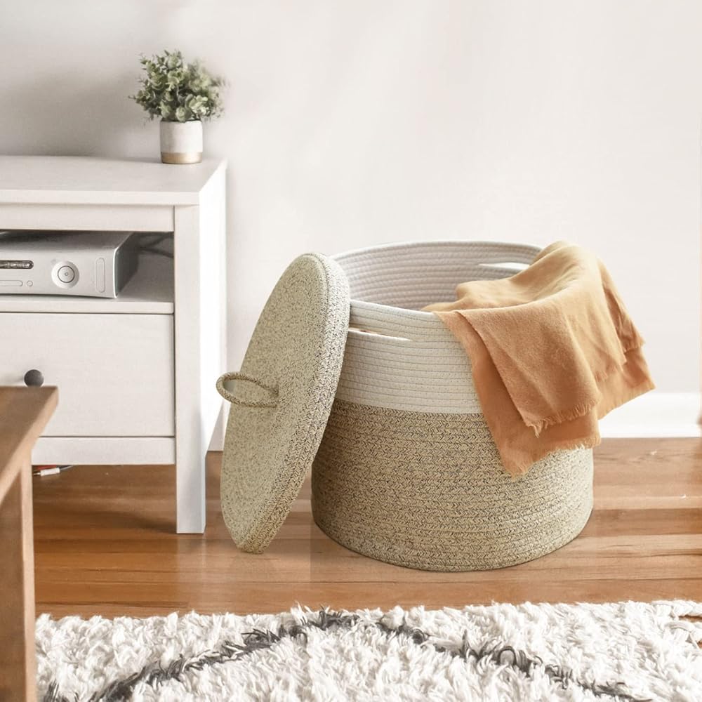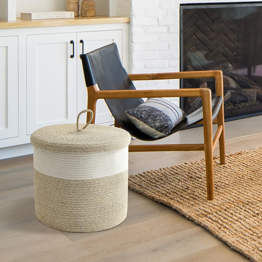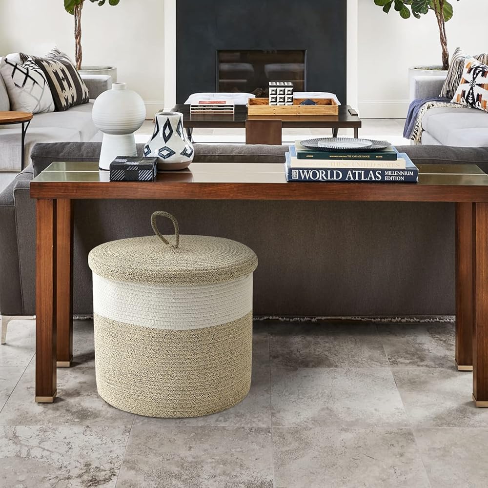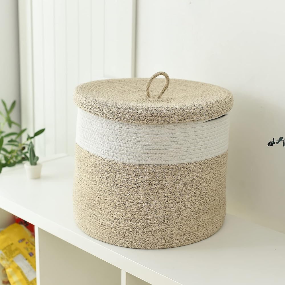 خامة فاخرة: مصنوعة من حبل منسوج بخيوط قطنية. سلة غسيل بمقابض وغطاء قويين، متينة وناعمة لذا فإن تحريك سلة الحبال المنسوجة سهل ويمكن وضعها في أي مكان في المنزل.