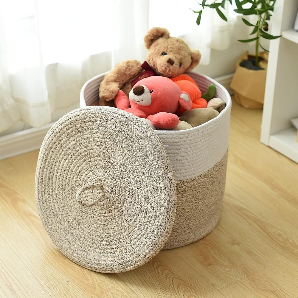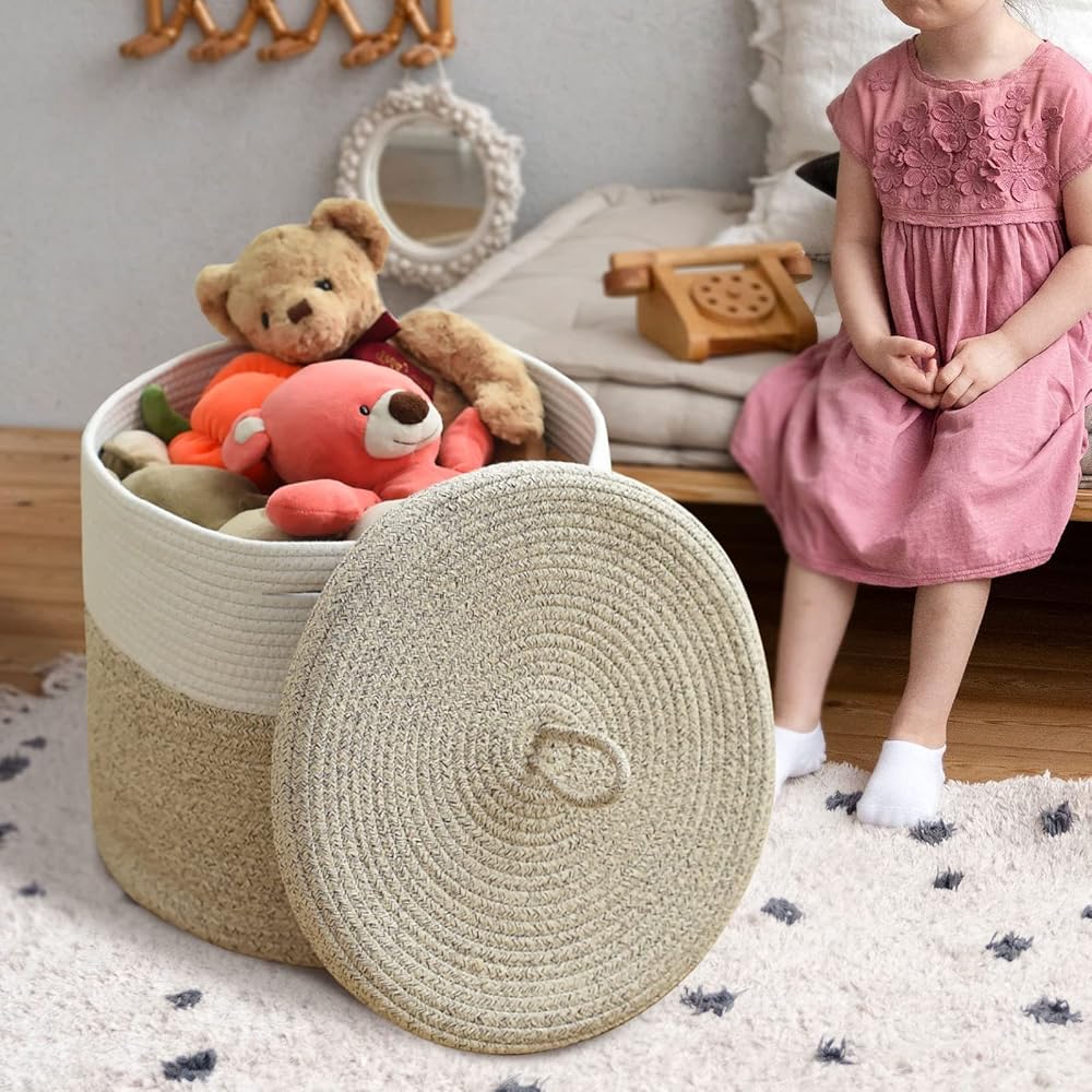 تخزين متعدد الأغراض: مقاس مناسب - 40.64 سم عمق × 35.56 سم ارتفاع. سلة تخزين من الحبال القطنية يمكنها حمل الملابس والألعاب والبطانيات والمناشف والمزيد على الأرض. احتفظ بها في غرفة الأطفال أو غرفة النوم أو الحمام أو أي غرفة في المنزل يمكن أن تستخدم مساحة تخزين إضافية
