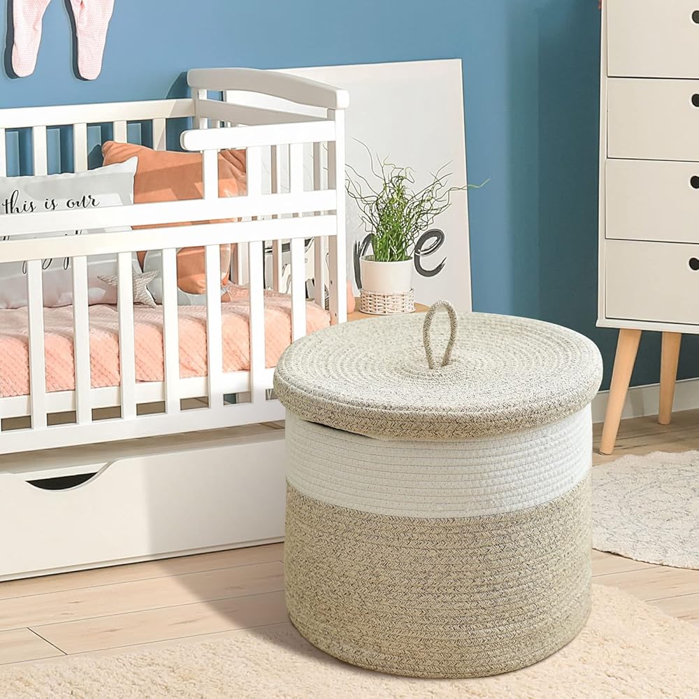 سلة تخزين من الحبال المنسوجة الناعمة والمتينة، لا تسبب خدوش تصادم، مثالية لاستيعاب ملابس الطفل والألعاب الأخرى في غرفة الأطفال، مصنوعة بشكل جميل، مقبضين، قابلة للطي، سهلة التنظيف.