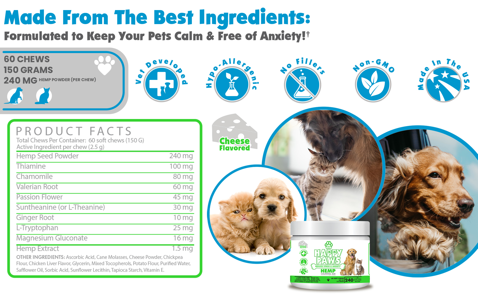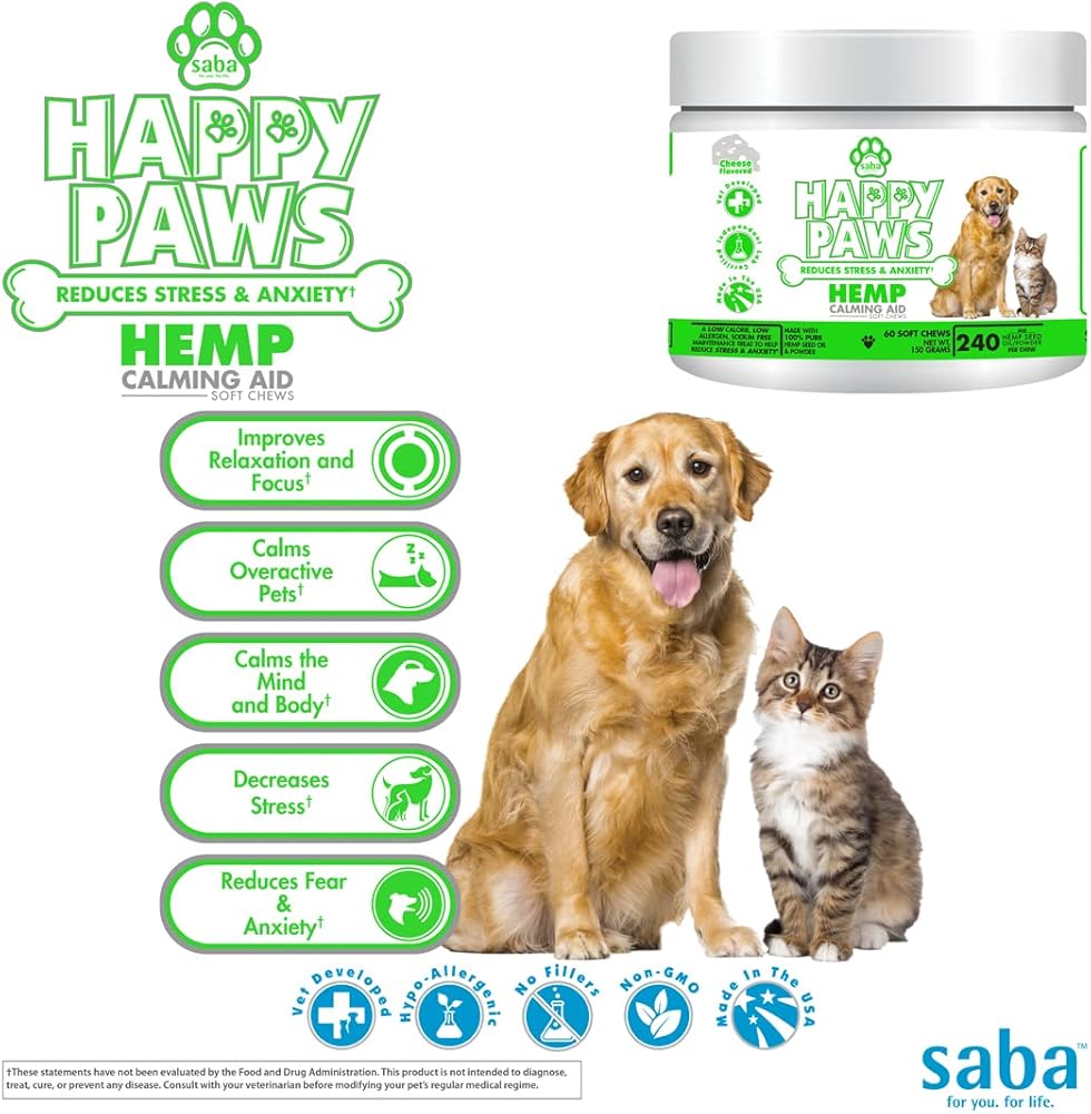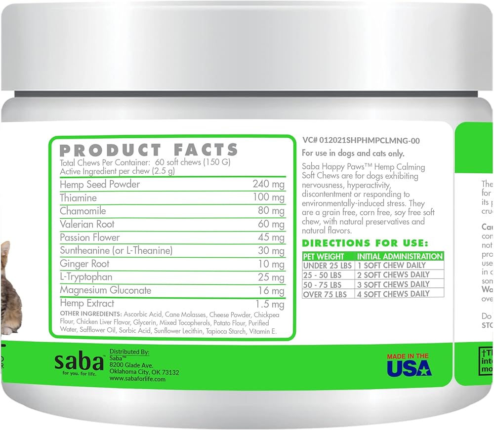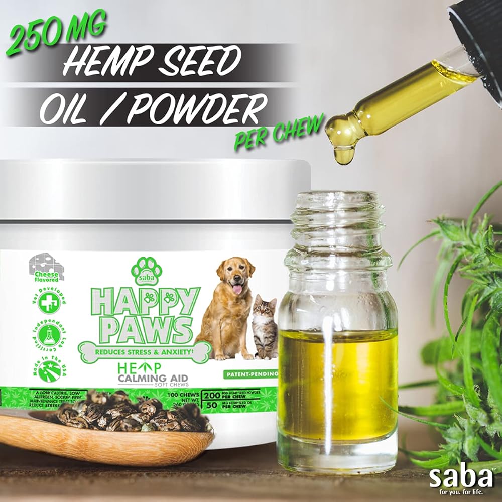 مصنوع من مسحوق وزيت بذور القنب، والبابونج، وإل تريبتوفان، والميلاتونين وغيرها من المكونات المتميزة التي تساعد جميعها على تهدئة وتقليل السلوك العدواني والقلق للكلاب والقطط.
