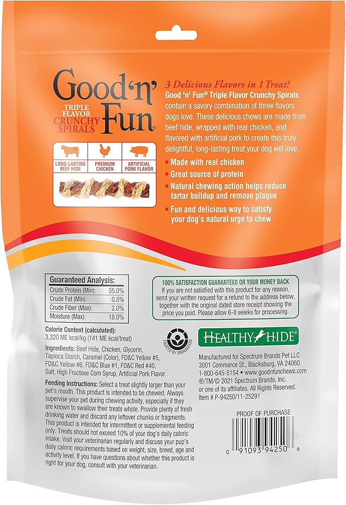 Good ‘n' Fun brand contains a savory combination of flavor that dogs love most. These delicious chew treats are made from the finest ingredients, including delicious beef hide, to create truly delightful, long-lasting treats your dog will love. Good ‘n' Fun Triple Flavor Crunchy Spirals contain a savory combination of three flavors dogs love. These delicious chews are made from long-lasting beef hide and delicious pork hide, then wrapped with real chicken to create this truly delightful, long-lasting treat your dog will love. Made with real chicken, these chews are a great source of protein for dogs of all sizes. Good ‘n' Fun Triple Flavor Crunchy Spirals are a fun and delicious way to satisfy your dog's natural urge to chew, while the natural chewing action helps reduce tartar buildup and remove plaque. Feed 1 chew to your dog daily and always supervise your dog while consuming.