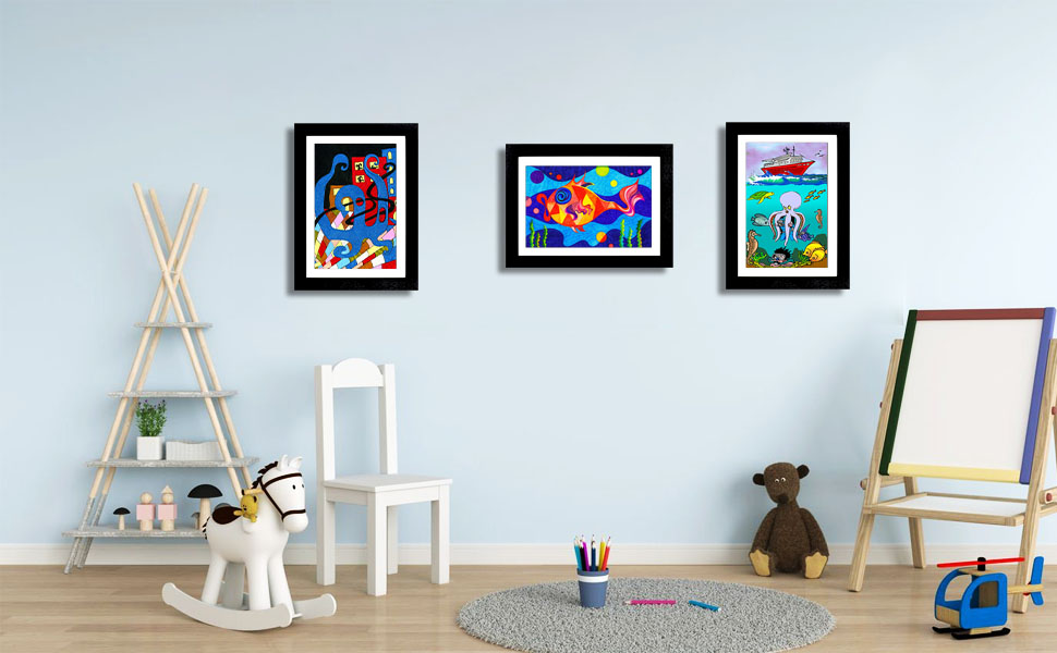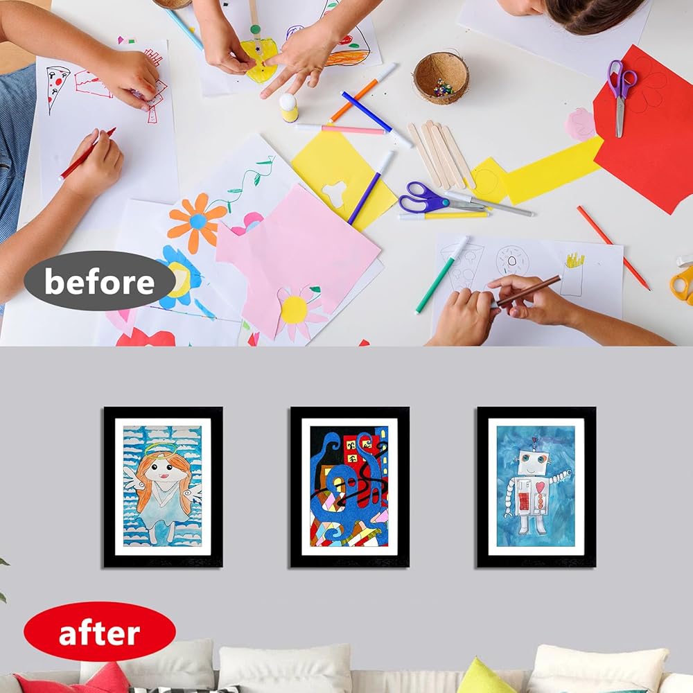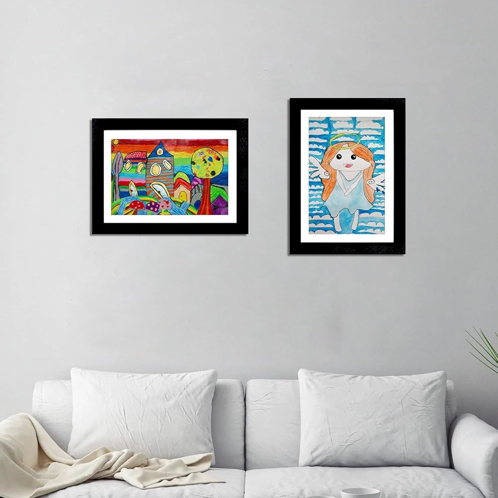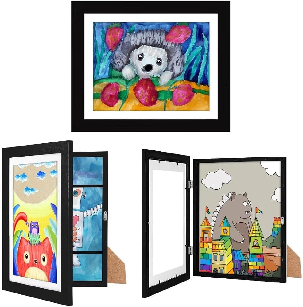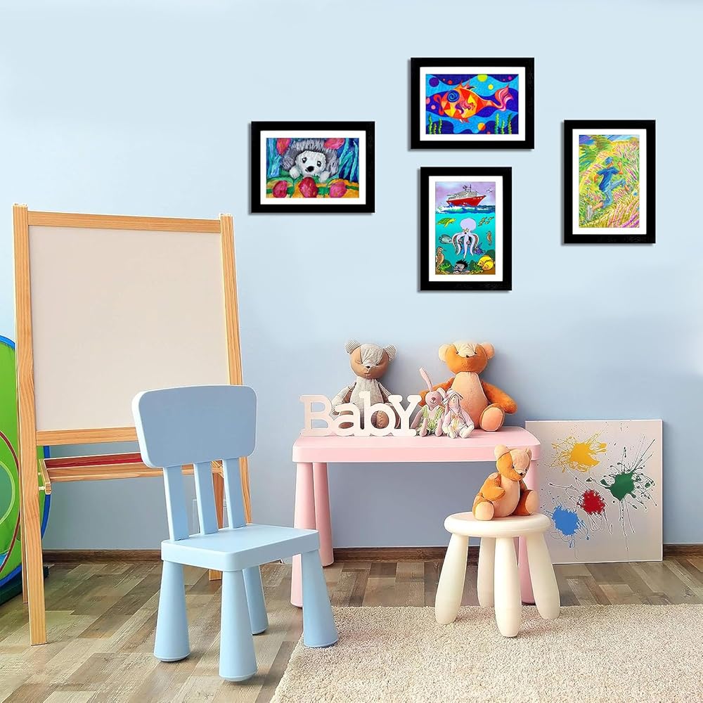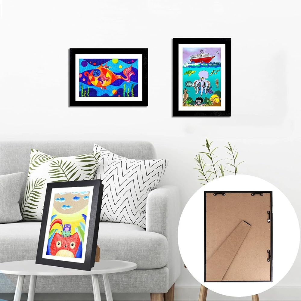 [عرض متنوع] تأتي الإطارات الفنية لفن الأطفال مع أربع شماعات مسننة للتعليق الرأسي والأفقي على الحائط الخاص بك. يمكن أن تساعدك الدعامة الموجودة على الجزء الخلفي من الإطارات الفنية على وضع الإطار الفني على الطاولة كإطار صورة تقليدي.