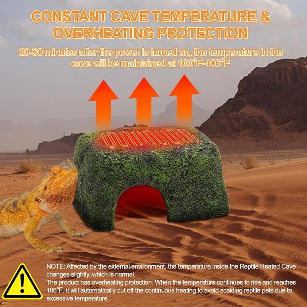 كهف إخفاء ثابت للتدفئة - ستستمر درجة حرارة كهف إخفاء الزواحف الساخنة في الكهف في الارتفاع بعد تشغيل الطاقة. يستمر التسخين لمدة 20-30 دقيقة، وسيتم الحفاظ على درجة الحرارة في الكهف عند 100 درجة فهرنهايت إلى 106 درجة فهرنهايت. وظيفة الحماية من ارتفاع درجة الحرارة الثابتة عندما تصل درجة الحرارة إلى 106 درجة فهرنهايت، ستقطع التسخين المستمر تلقائيًا لمنع حرق الزواحف بسبب درجة الحرارة الزائدة.