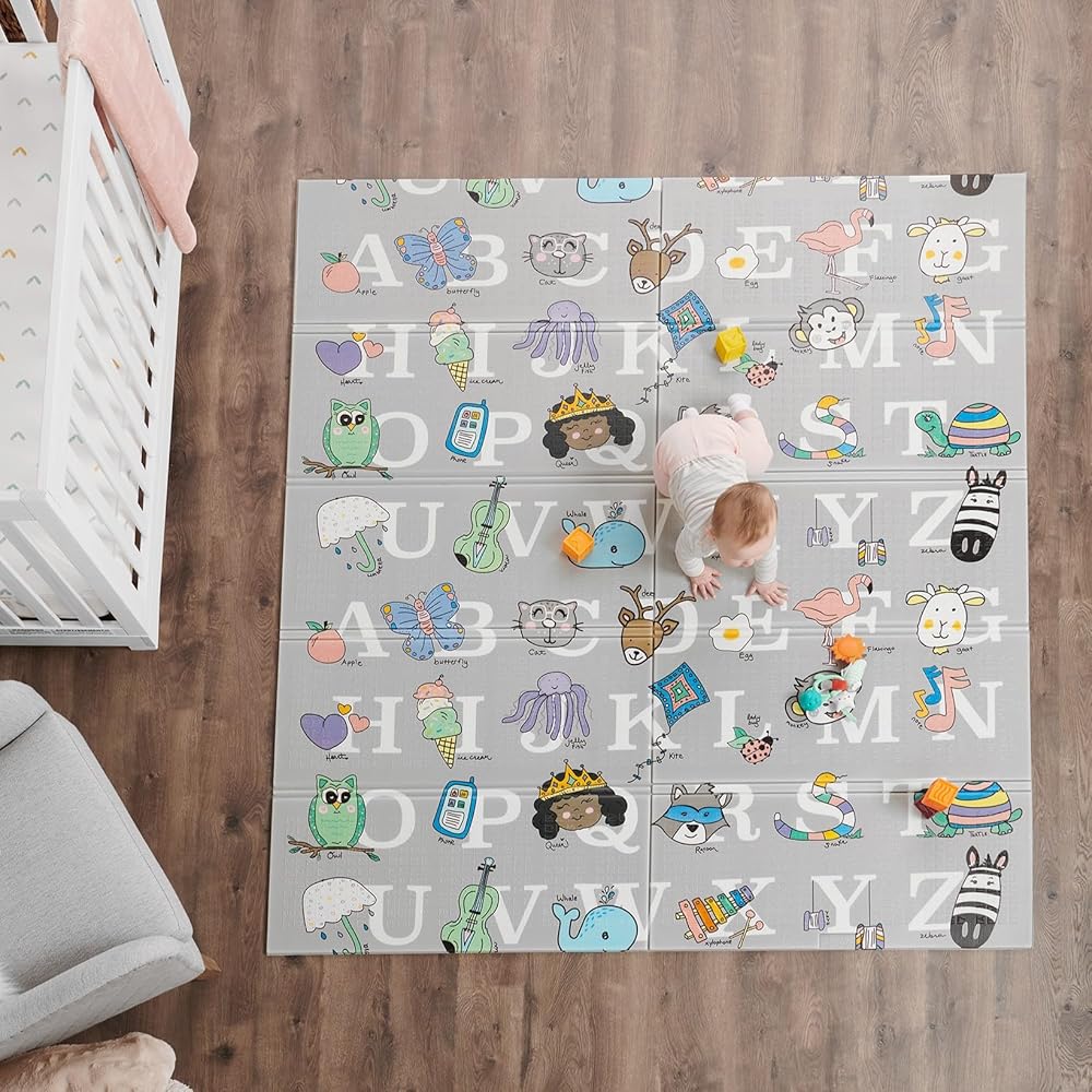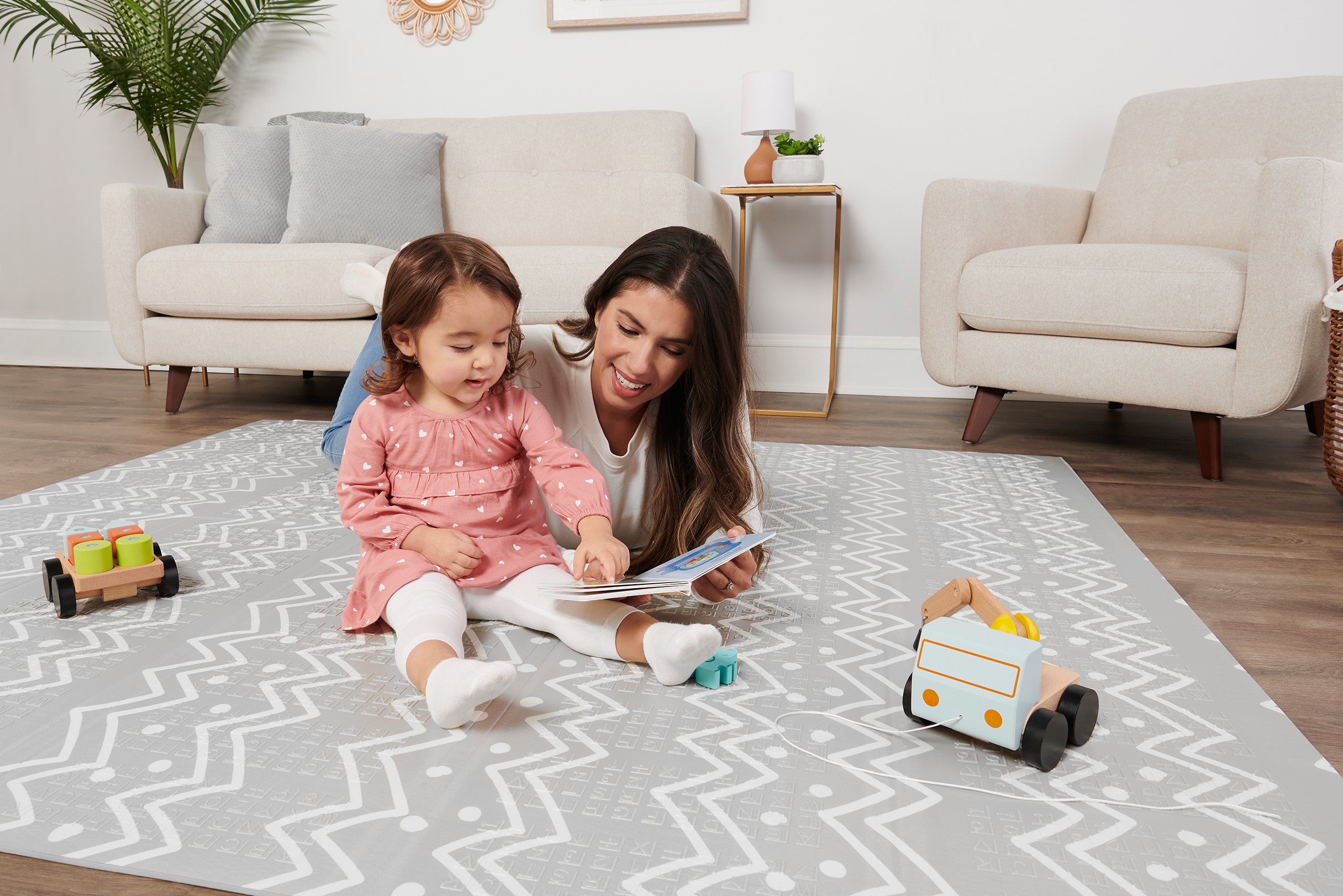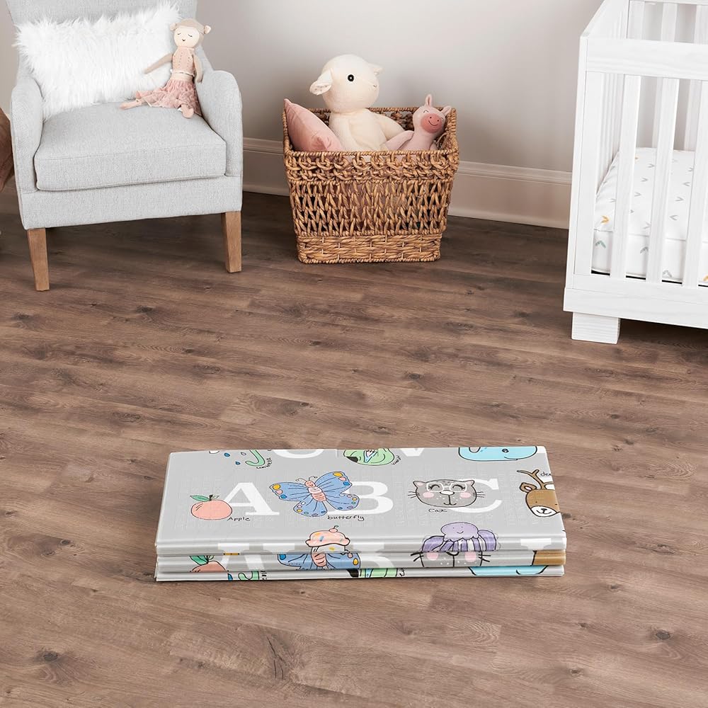 The Regalo My play mat is a lightweight, foldable, play mat ideal for home, when traveling, or time spent outdoors. Plus, it only takes a few seconds to set up. This attractive play mat is reversible with fun Alphabet characters on one side and a gray. Chevron pattern on the opposite side. It measures 77" Wide and 71" And is made with soft foam that is gentle for little hands and feet. It can easily be wiped down with a wet cloth and is ideal for children from 0+ months. Regalo My play mat dimensions: 77" W x 71" H ages: 0+ months sets up in seconds compactly folds easy, reversible mat lightweight with soft foam easily wipes down with wet cloth for indoor and outdoor use. Can be used with our my play portable play yard or super wide play yards model: 4100.