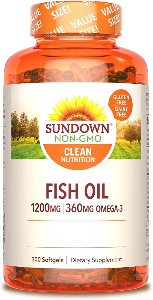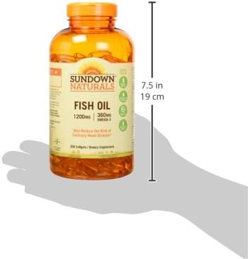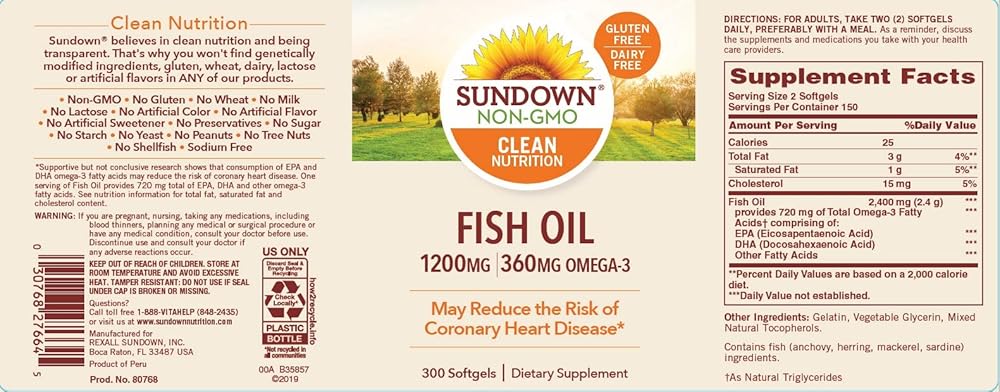 Support heart health with Sundown Fish Oil 1200mg softgels. (2) This fish oil Omega 3 supplement contains eicosapentaenoic acid (EPA) and docosahexaenoic acid (DHA), two fatty acids that help support and maintain the health of your cardiovascular system. (2) Each serving contains 720mg of Omega-3 fatty acids and contributes to healthy circulation and metabolic health. (2) In addition, this fish oil supplement is purified to eliminate heavy metal contaminants, such as mercury. For adults, take two (2) softgels daily, preferably with a meal. At Sundown, we believe in living clean (1)…and being transparent. That's why you won't find genetically modified ingredients, gluten, dairy, or artificial flavors in any of our products. Choose Sundown for premium clean vitamins, without the premium price. (1) Contains 300 softgels. (1) Clean defined as all products non-GMO and free of gluten, wheat, dairy, lactose and artificial flavors (2) Supportive but not conclusive research shows that consumption of EPA and DHA Omega-3 fatty acids may reduce the risk of coronary heart disease. See supplement facts panel for Omega-3 content.