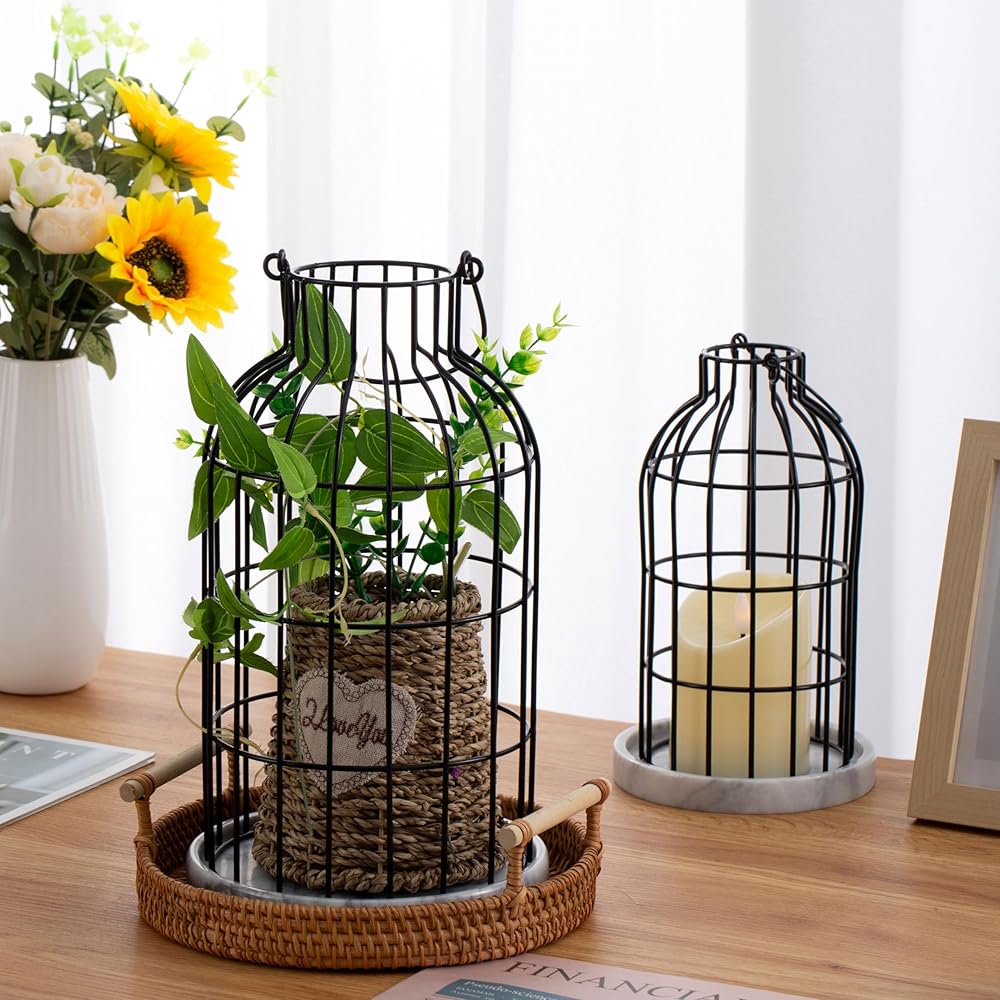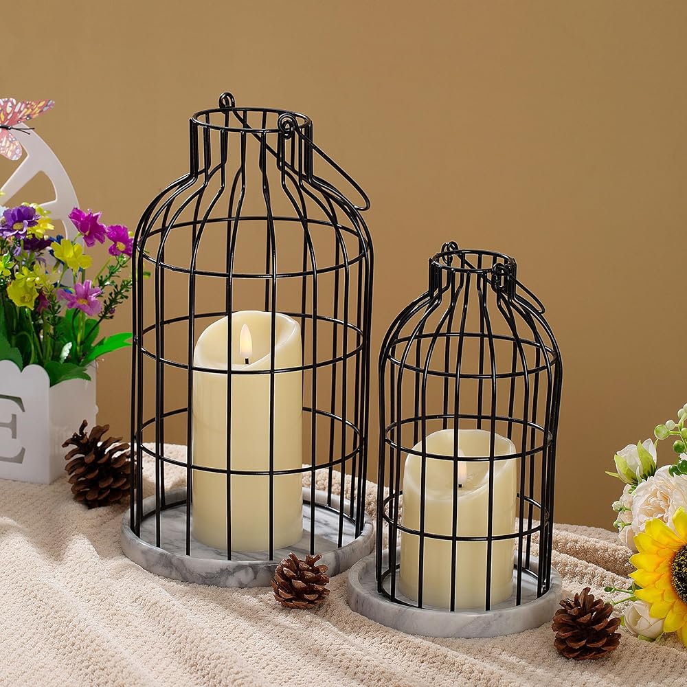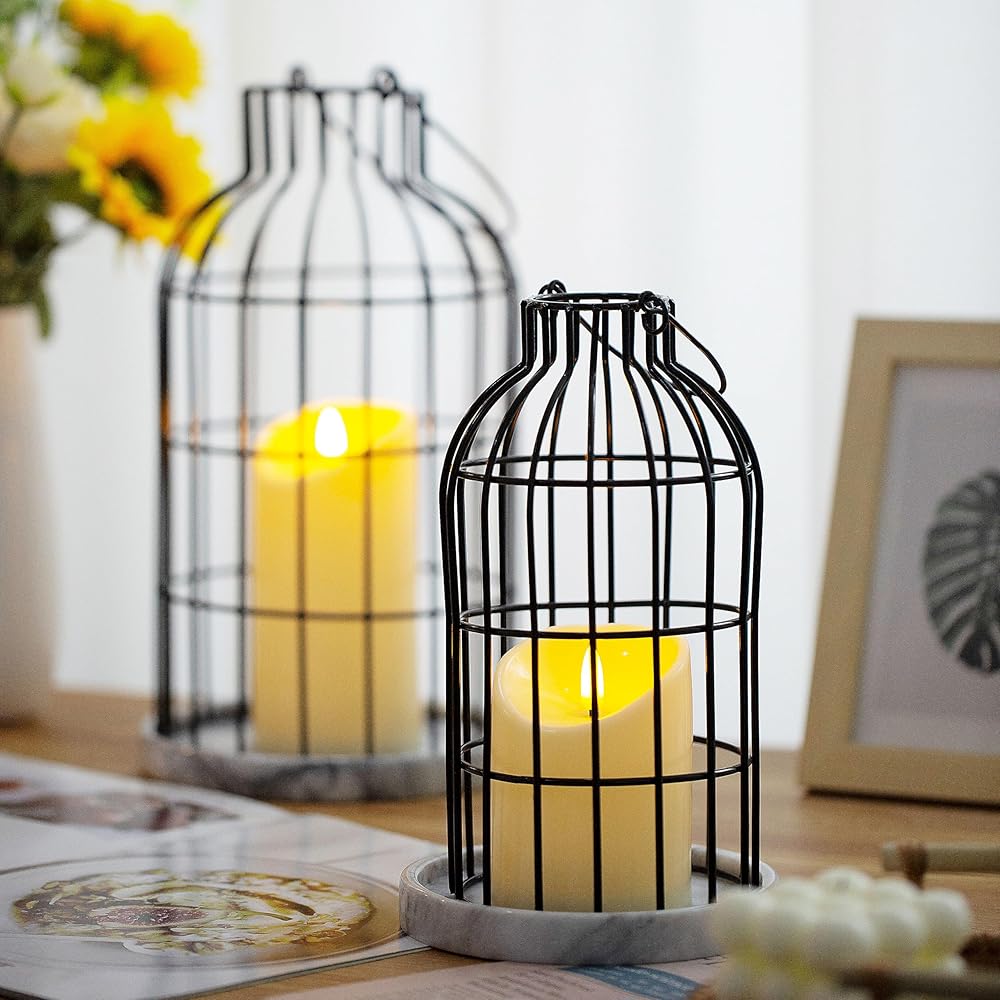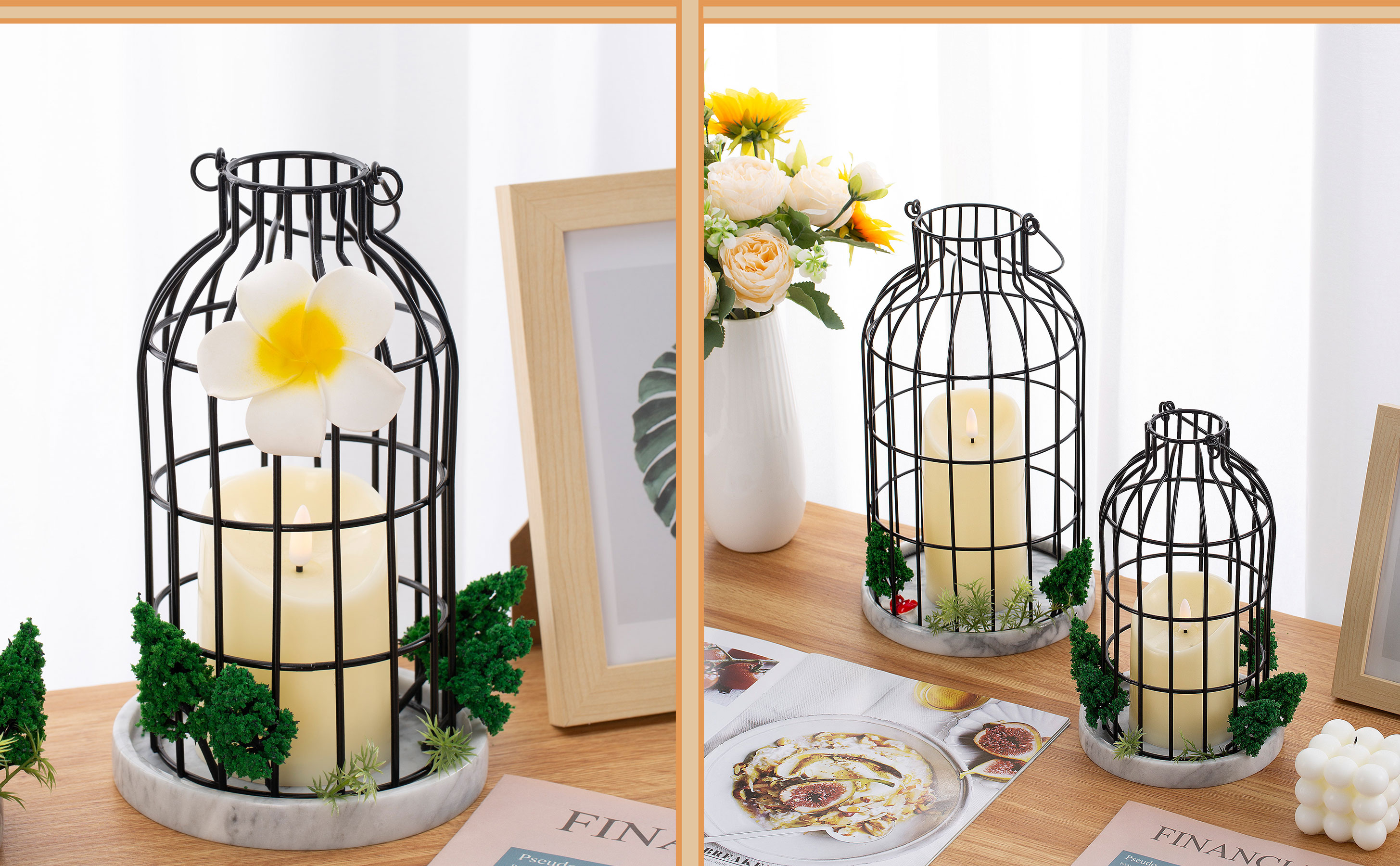 【مادة فريدة】فوانيس الشموع المزخرفة الخاصة بنا مصنوعة يدويًا بدقة بإطار معدني أسود قوي وقاعدة رخامية طبيعية، مما ينتج عنه مزيج رائع من المواد. ارتقِ بديكور منزلك بطريقة مميزة حقًا مع هذه الفوانيس الساحرة! سواء تم استخدامها كديكور للطاولة أو الأرضية، فإنها تعزز أي مكان داخلي أو خارجي دون عناء. (الشموع غير متضمنة)