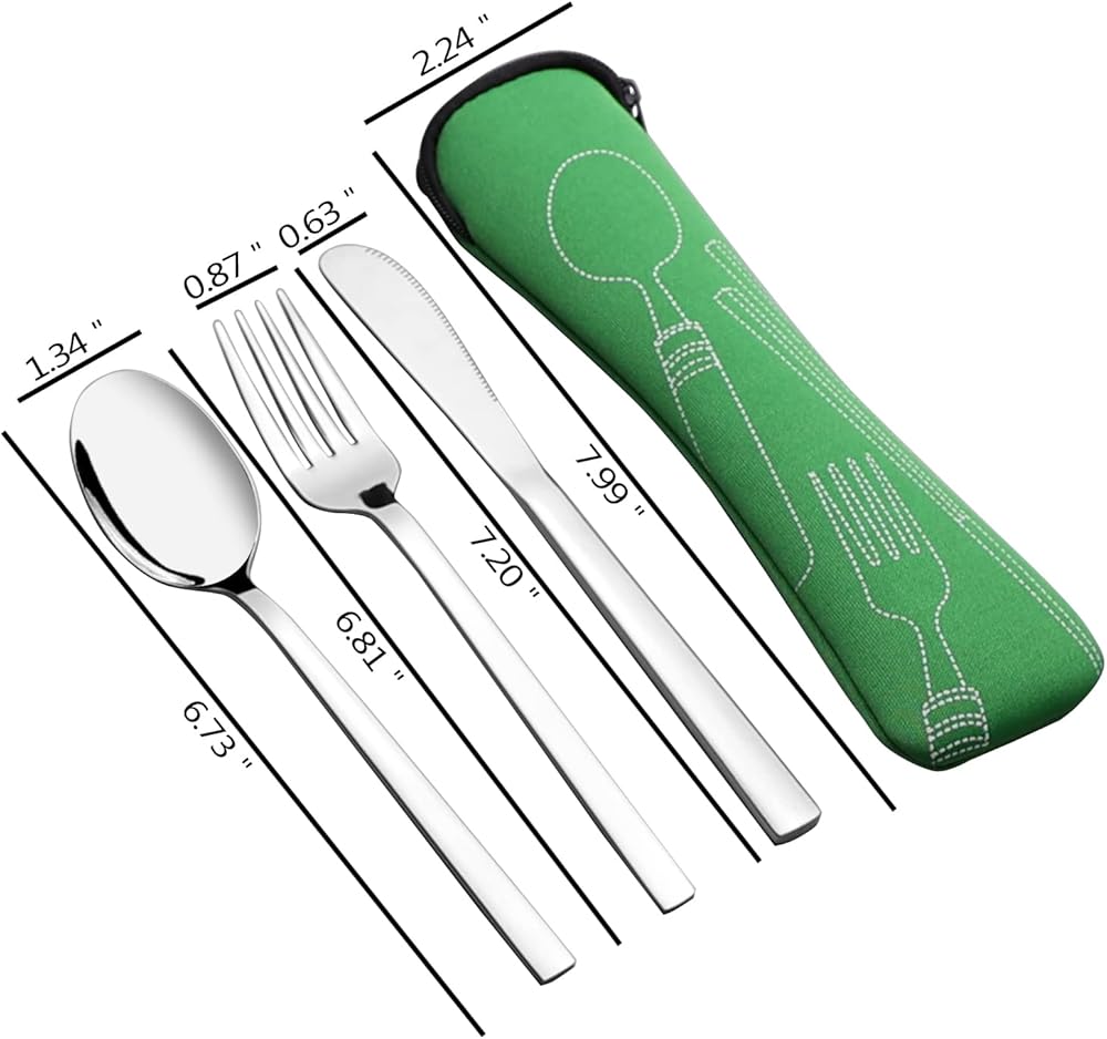- المقاس: الشوكة: 6.9 بوصة، الملعقة: 6.8 بوصة، السكين: 7.2 بوصة