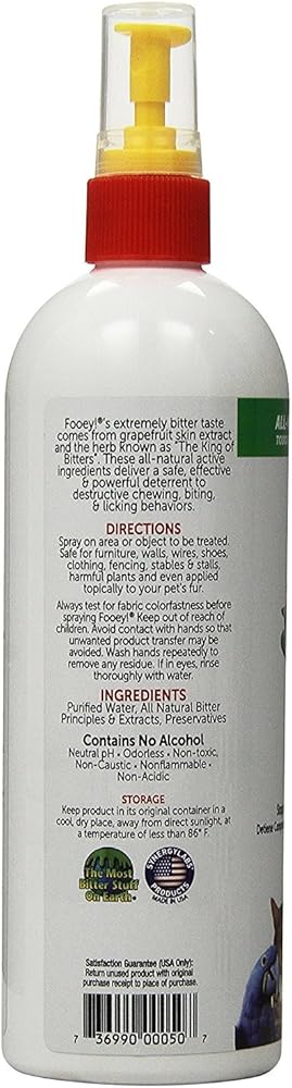 (3 عبوات) فوي! بخاخ مرير للغاية، لدينا بالفعل علامة تجارية مسجلة لنقول إنها "أكثر الأشياء مرارة على وجه الأرض!" يأتي الطعم المر للغاية من مستخلص جلد الجريب فروت والأعشاب المعروفة باسم "ملك المرار". توفر هذه المكونات النشطة الطبيعية بالكامل رادعًا آمنًا وفعالًا وقويًا للمضغ والعض واللعق وغيرها من السلوكيات المدمرة للكلاب والقطط والخيول والأرانب والقوارض والطيور. بأسعار معقولة أكثر من استبدال متعلقاتك، استخدم فووي! جنبًا إلى جنب مع طرق التدريب لمنع الحيوانات الأليفة من لعق وعض ومضغ وتدمير أي شيء قد ترغب في ملاحقته في منزلك. بخاخ فووي! على أي شيء وستحوله على الفور إلى شيء بغيض تمامًا. خالٍ من الكحول والعطور والروائح والصبغات، بخاخ درجة الحموضة المحايدة غير قابل للاشتعال وغير حمضي وغير كاوي. متوفر في زجاجات بسعة 4 أو 8 أو 16 اونصة، وهو آمن للأثاث والجدران والأسلاك والأحذية والملابس والسياج والإسطبلات والأكشاك والنباتات الضارة. كما أنه آمن للاستخدام مباشرة على جلد حيوانك الأليف لتثبيط قضم ولعق الغرز والبقع الساخنة والمناطق الملتهبة. ثق بنا، سيكرهه كلبك أقل من مخروط الرأس التقليدي. يمكنك حتى استخدام فووي! في الهواء الطلق لإغلاق بوفيه الحديقة الذي يعمل على مدار 24 ساعة ومنع الغزلان والأرانب وطيور الخشب وغيرها من الحشرات من أكل نباتاتك وزهورك. وفر الوقت والمال والإحباط داخل وخارج منزلك. نحن نعلم أن حيواناتك أكثر من مجرد حيوانات أليفة - فهي جزء من العائلة - لذا فوي! تصمم منتجات التدريب التي تعمل ويمكن لمربي الحيوانات الأليفة تحملها بالفعل. ستتوقف حيواناتك الأليفة عن العض واللعق ومضغ كل ما لا ينبغي عليها، وستحصل على مساعدة تدريب آمنة وفعالة في ترسانتك - مما يجعلك سعيدًا وقادرًا على التركيز على الأشياء الأكثر أهمية مثل المشي والجلب والعناق.