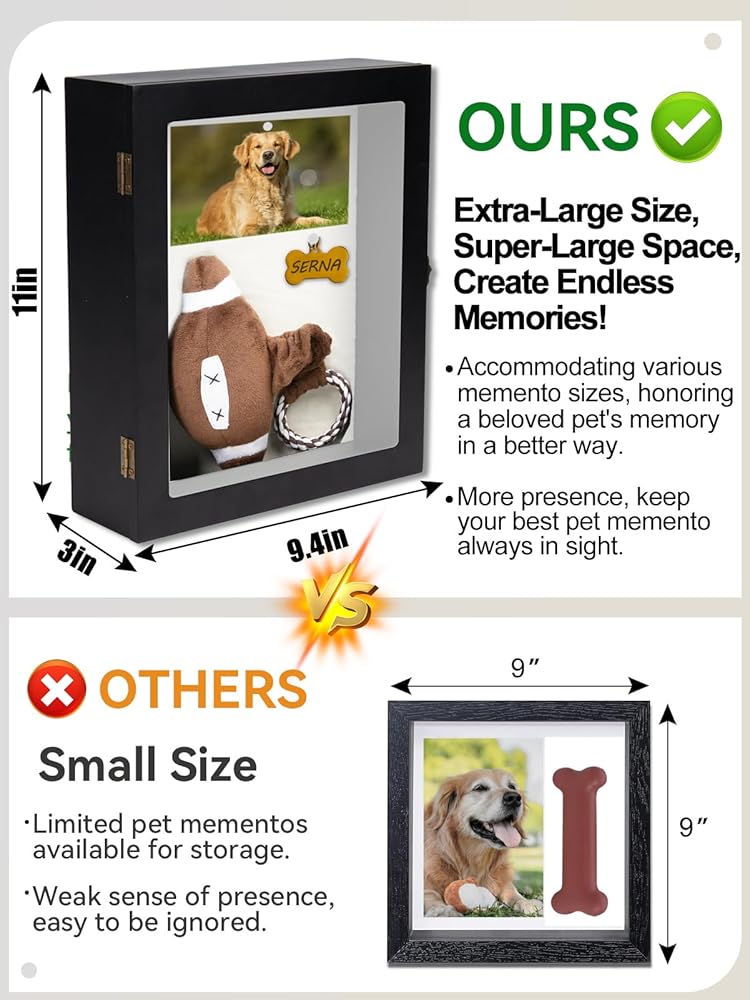Sturdy Density Board: Our pet memory box has been upgraded for the quality of the normal pet memorial frame, it is made of high quality density board, which is more strong and sturdy, the surface is sprayed with a black paint, the texture is very good, the high definition acrylic front panel can clearly display the dog's collar, photos, so you can see your best friend's souvenir items all the time.