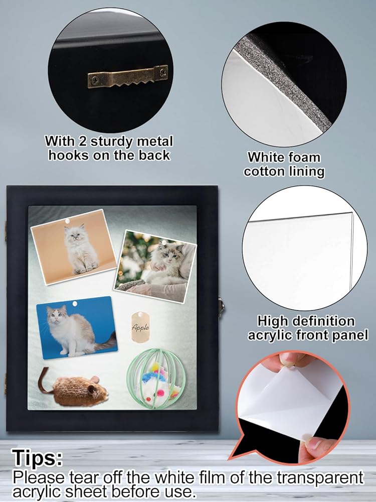 Large Space: The overall size of this cat picture frame is 9.4'' x 11'' x 3'', which has enough space to store the ID tags, paw prints, collars and other mementos of lost dogs, you can pin photos about their growing record on thick sponge pads by using the included fixing nails.