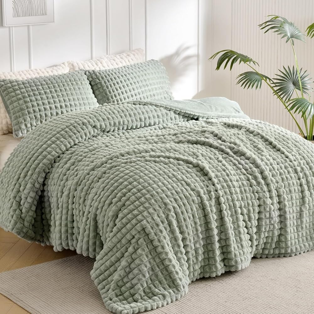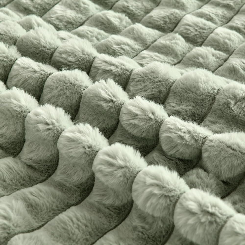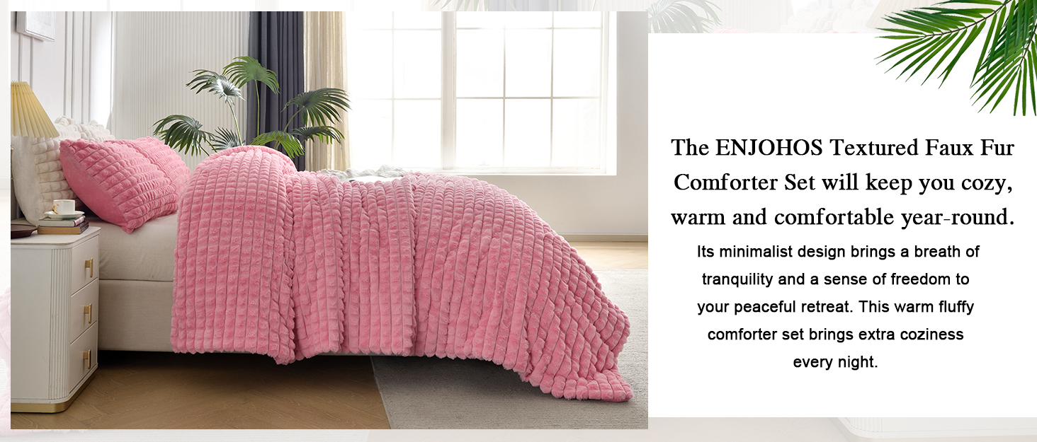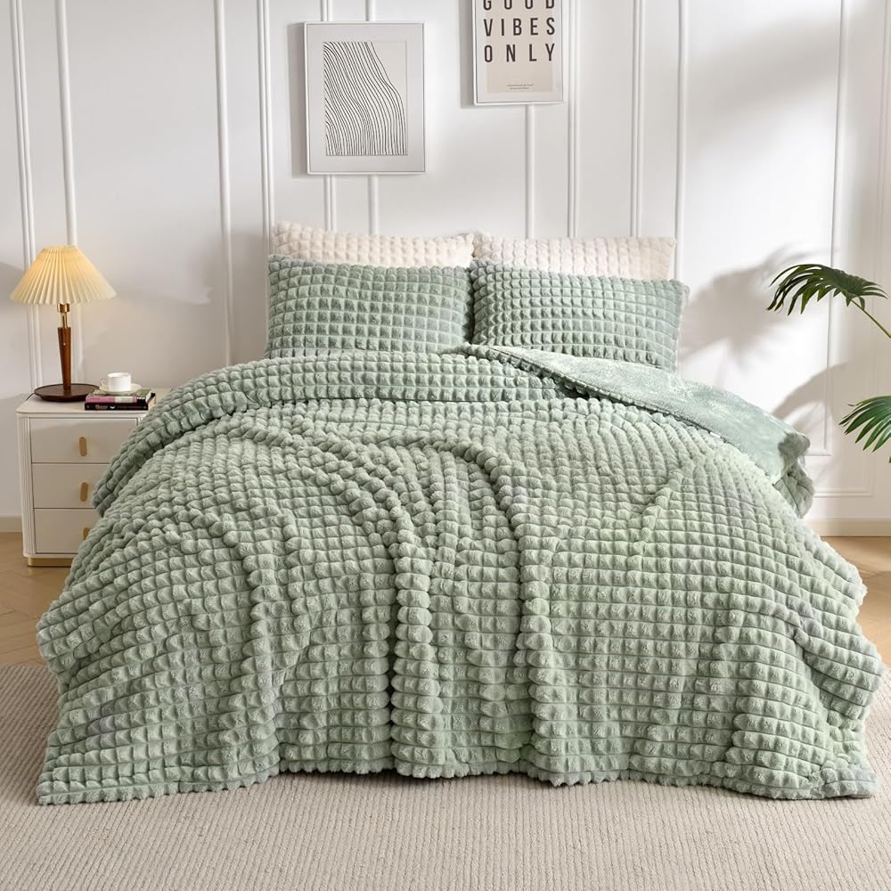 صناعة متقنة: طقم لحاف فروي كوين. تضمن الخياطة عالية الكثافة توزيعًا متساويًا للحشوة، مما يمنع التحول أو التكتل. وهذا يضمن الدفء الفائق والمتانة لهذا اللحاف المخملي الأشعث.
